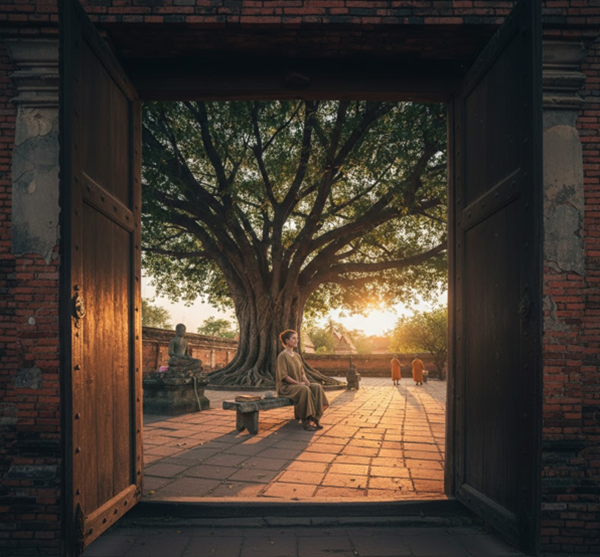 Tôi chọn ngồi thật lâu dưới một gốc cây cổ thụ trong sân chùa. Thân cây xù xì, rễ nổi lên mặt đất như những nếp nhăn của thời gian, chứng kiến bao mùa mưa nắng, bao đổi thay của đời người. Dưới tán cây ấy, tôi thấy mình nhỏ lại, những mệt mỏi cũng vì thế mà bớt nặng nề hơn. Thoảng đâu đó là tiếng hót trong veo của một chú chim, bất chợt vang lên rồi im bặt, như một nốt nhạc khẽ khàng điểm vào bản hòa âm tĩnh lặng của chốn thiền môn.