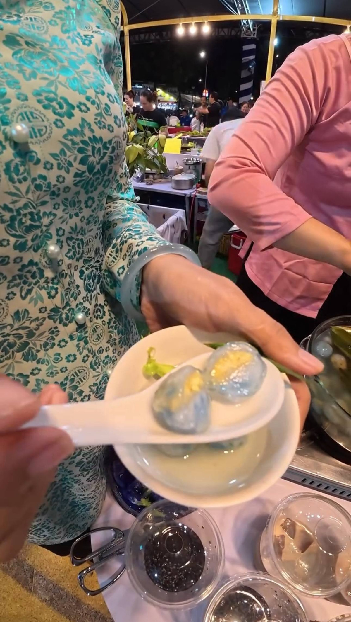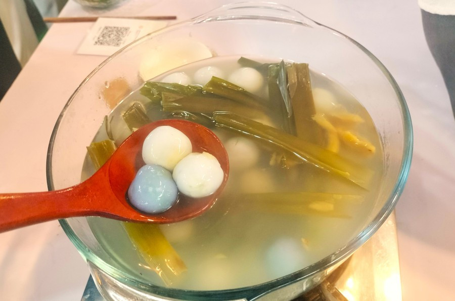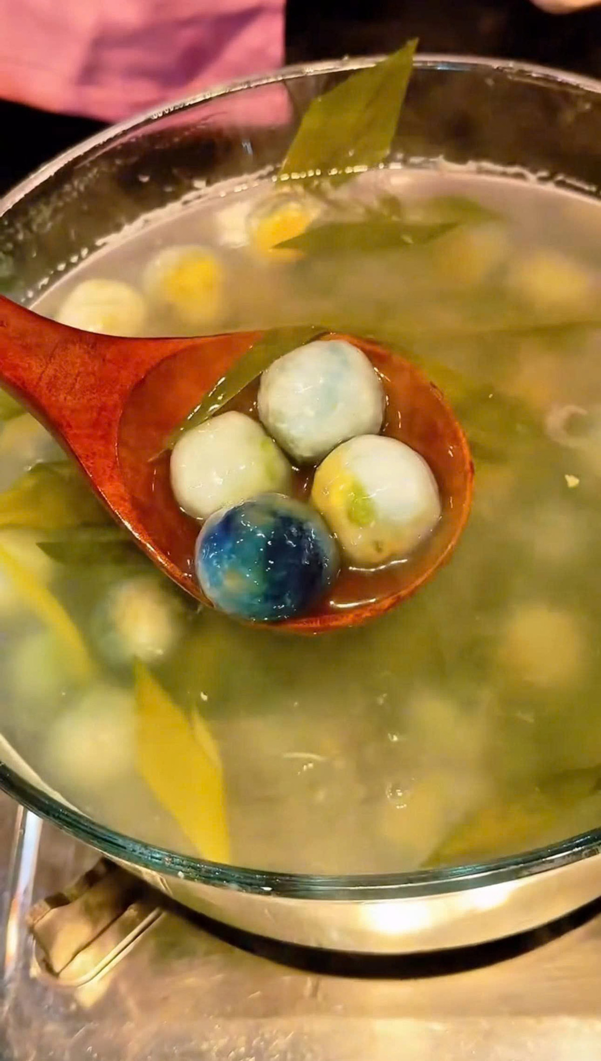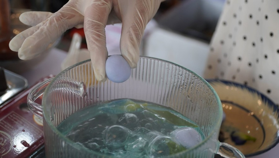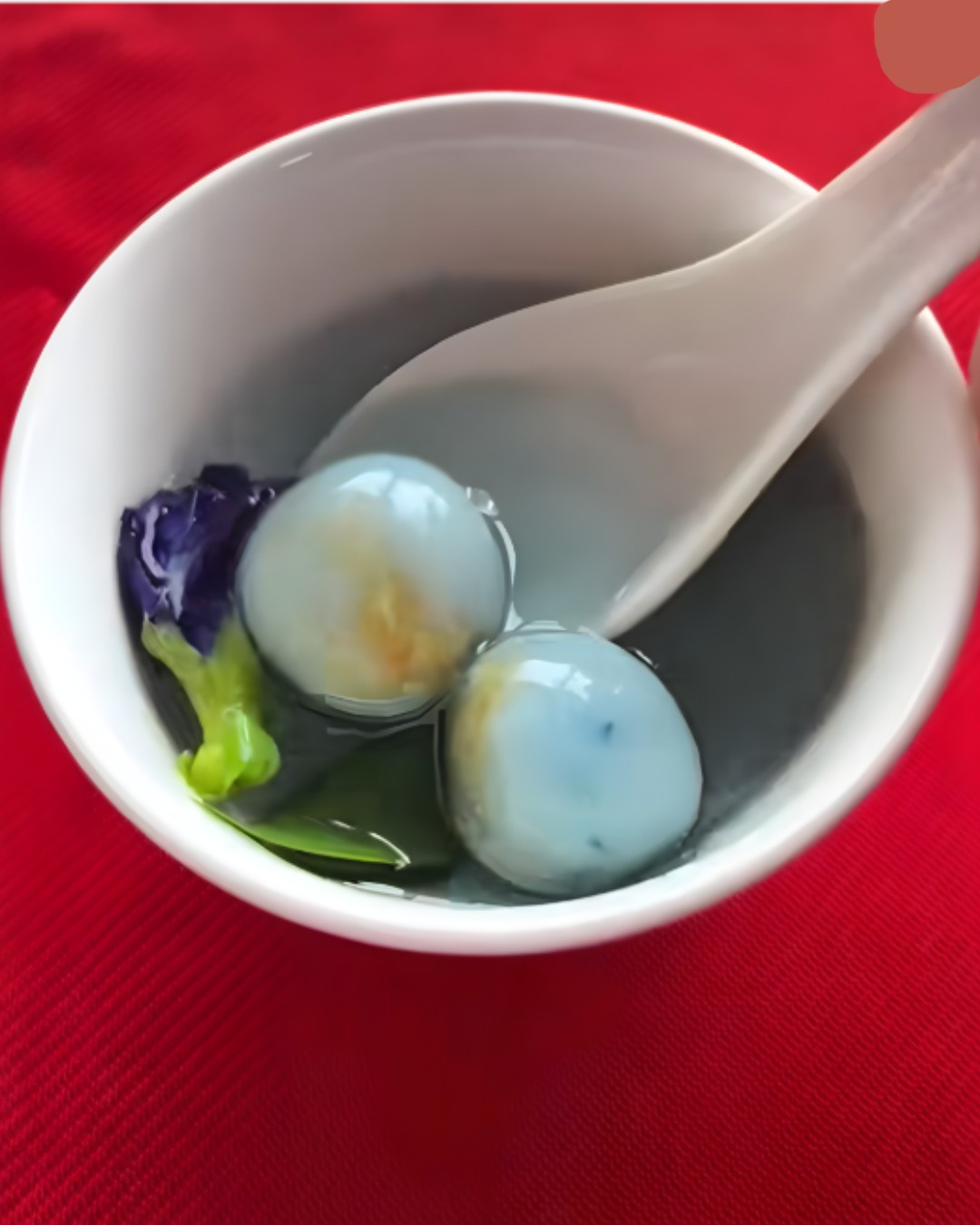 Các viên chè sau khi vo xong sẽ được luộc qua nước sôi để lớp bột không bị chai cứng, rồi mới thả vào nồi nước chè nấu cùng đường phèn, gừng và một chút muối để cân bằng vị. Khi hoàn thiện, món chè có độ dai giòn của lớp bột, nhân cua đậu xanh vừa mặn vừa béo, hòa quyện cùng nước chè thơm mát mùi lá dứa và sắc tím đẹp mắt từ hoa đậu biếc. Ảnh baogiaoducthoidai