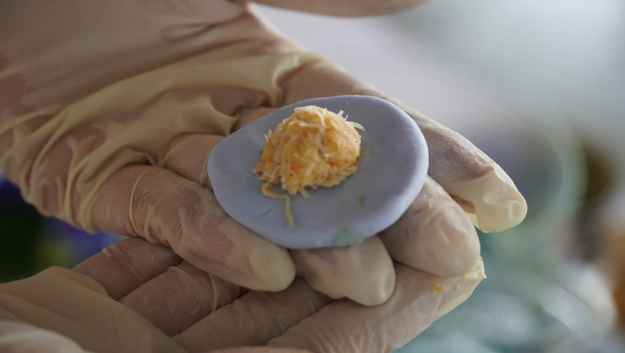 Cua sau khi hấp được gỡ thịt, xào cùng đậu xanh để tạo độ kết dính và vị bùi. Phần vỏ bọc làm từ bột nếp, nhào kỹ để đạt độ dẻo mịn rồi bao lấy nhân cua đậu xanh, vo thành từng viên tròn. Ảnh YanFood