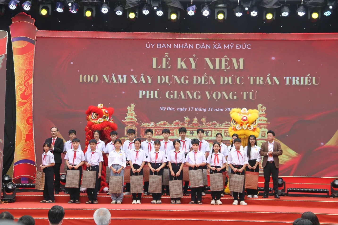 Trong khuôn khổ lễ kỷ niệm, xã Mỹ Đức và đại diện hậu duệ Thánh Tổ Trần Quốc Tuấn đã trao suất quà cho học sinh trên địa bàn xã.