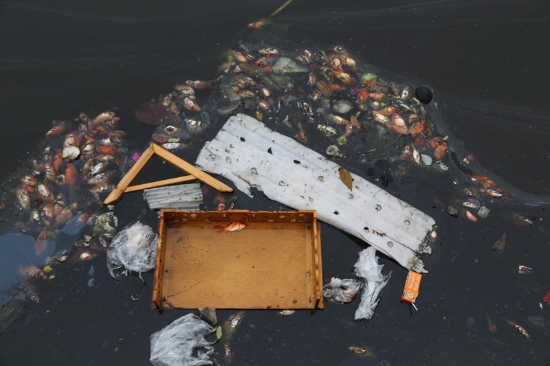 Chỉ vài tiếng sau khi được thả, cá chết nổi lên mặt hồ cùng rác thải.
