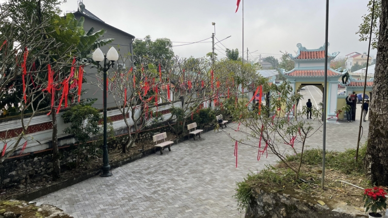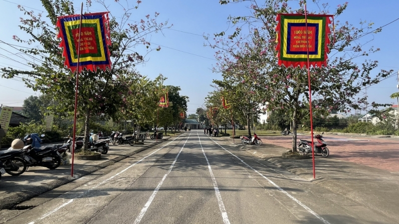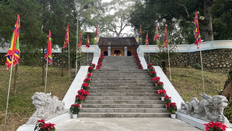 Lối đi 2 bên đường lên đền Kỳ sầm được trang trí cờ, hoa trang trọng,