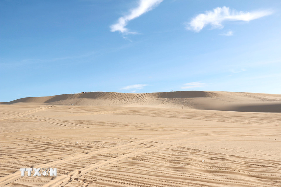 Những đồi cát cao vút trải dài với nhiều hình dạng độc đáo và thay đổi thường xuyên dưới tác động của gió, thu hút du khách khi đến tham quan Bàu Trắng. (Ảnh: Nguyễn Thanh/TTXVN)