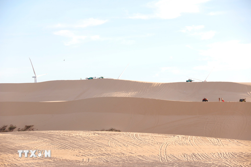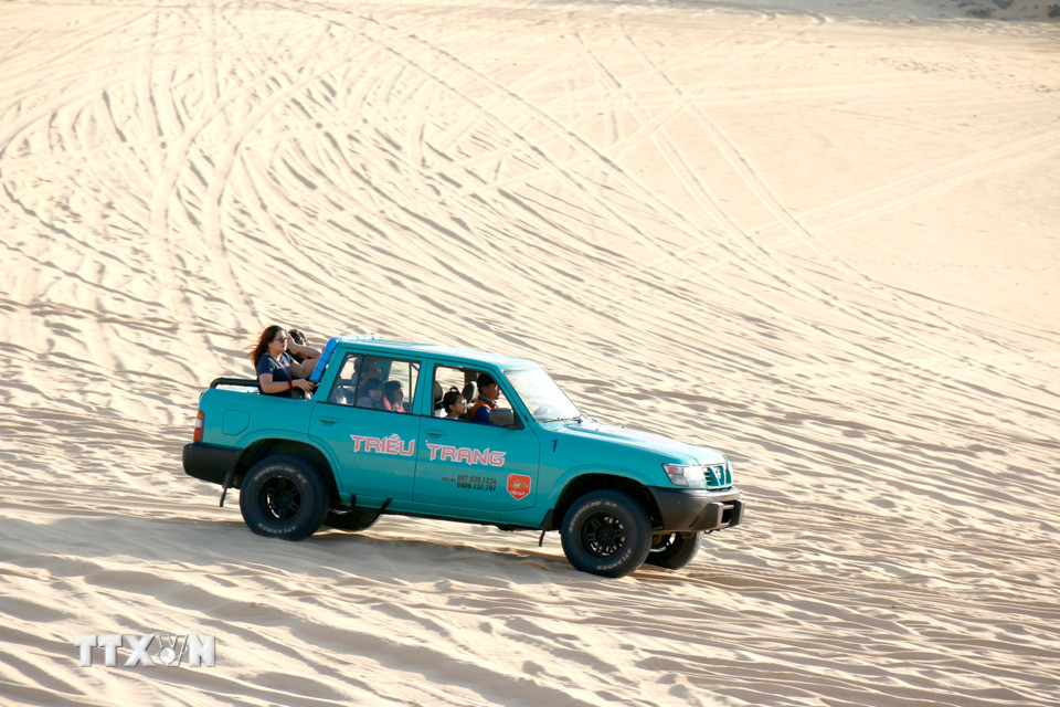 Trải nghiệm đi xe địa hình vượt đồi cát Bàu Trắng, mang lại cảm giác mạnh cho du khách. (Ảnh: Nguyễn Thanh/TTXVN)