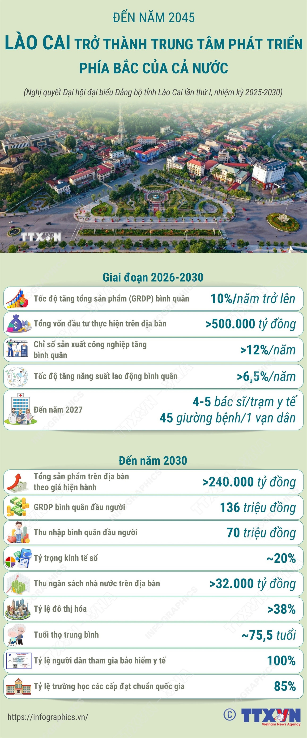 Đến năm 2045, Lào Cai trở thành trung tâm phát triển phía Bắc của cả nước; là trung tâm kết nối giao thương kinh tế giữa Việt Nam và các nước ASEAN với Trung Quốc và Châu Âu". Hiện thực hóa mục tiêu phát triển “xanh, hài hòa, bản sắc, hạnh phúc”./.