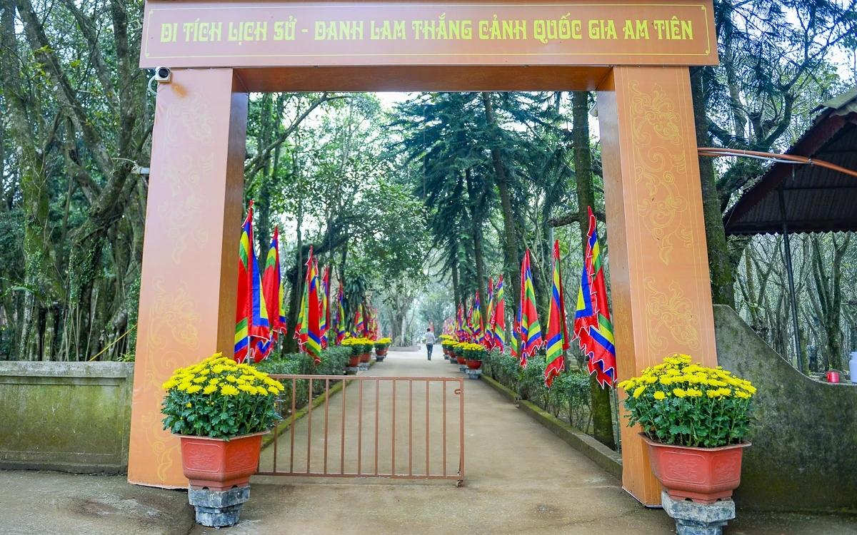 Lối vào Di tích Am Tiên rực rỡ cờ hội và sắc hoa.