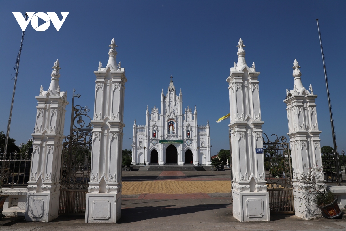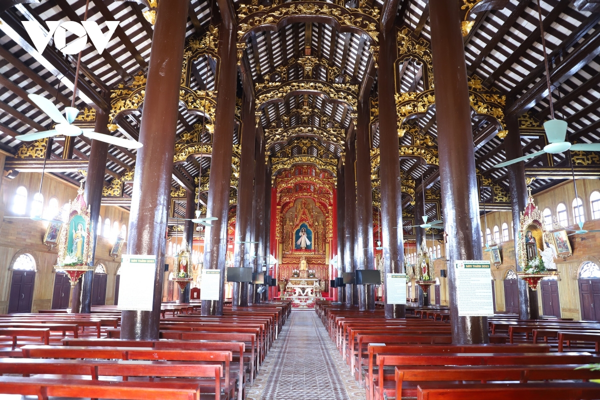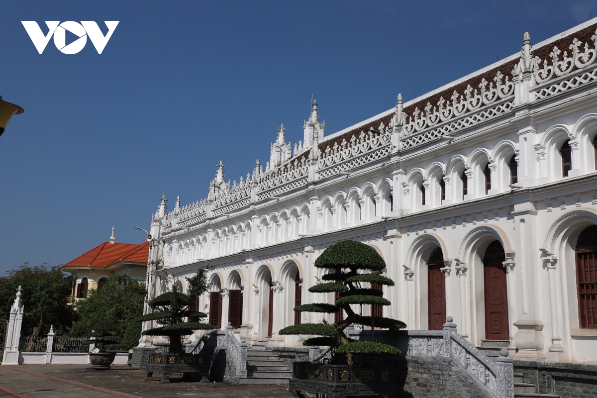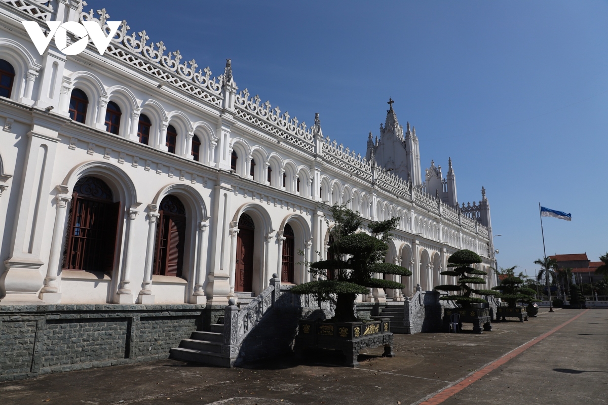 Không gian kiến trúc bên hông Đền Thánh Liễu Đề, nơi nổi bật các đường vòm cong và hoa văn mang đậm phong cách Công giáo truyền thống.