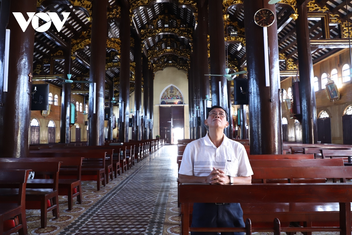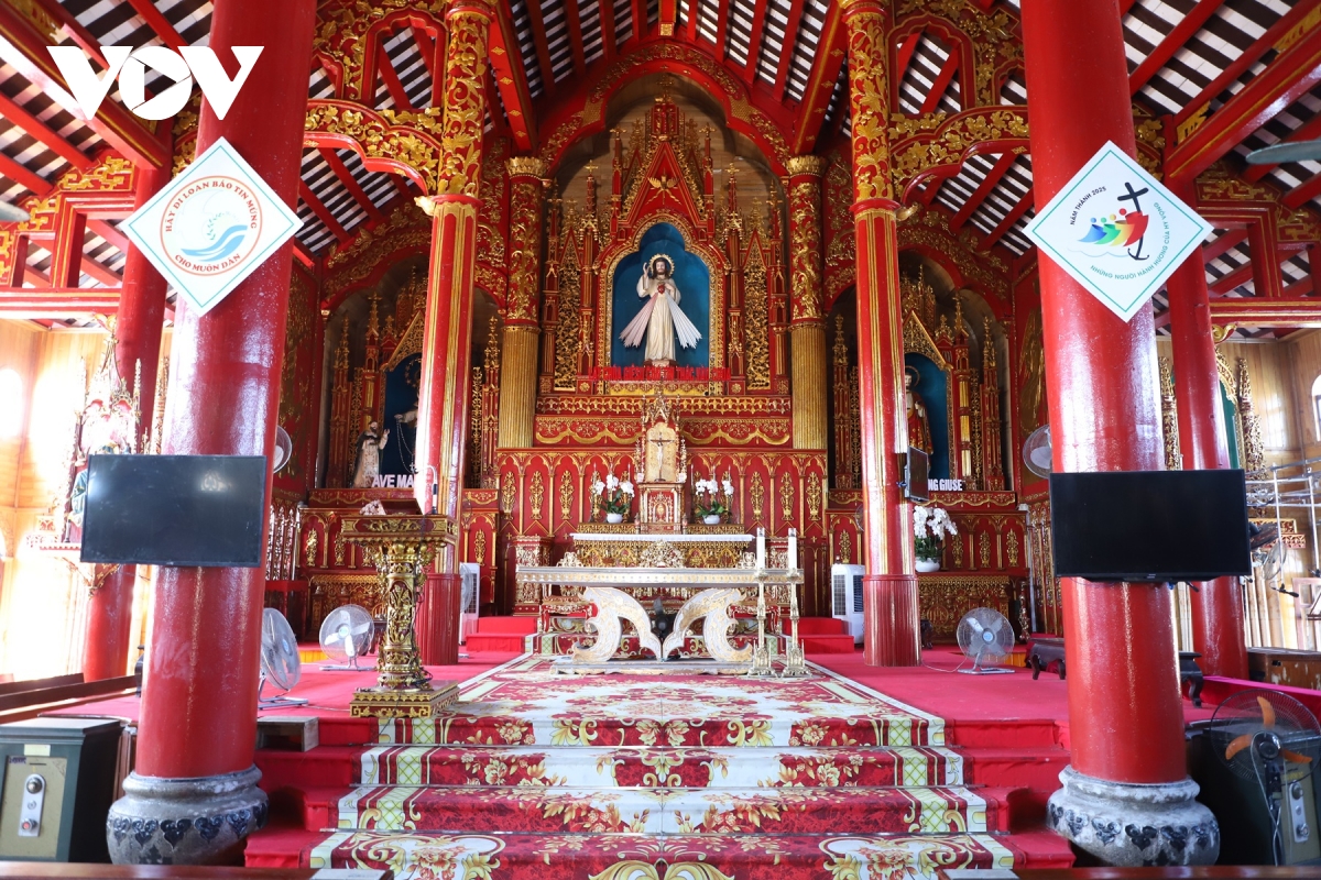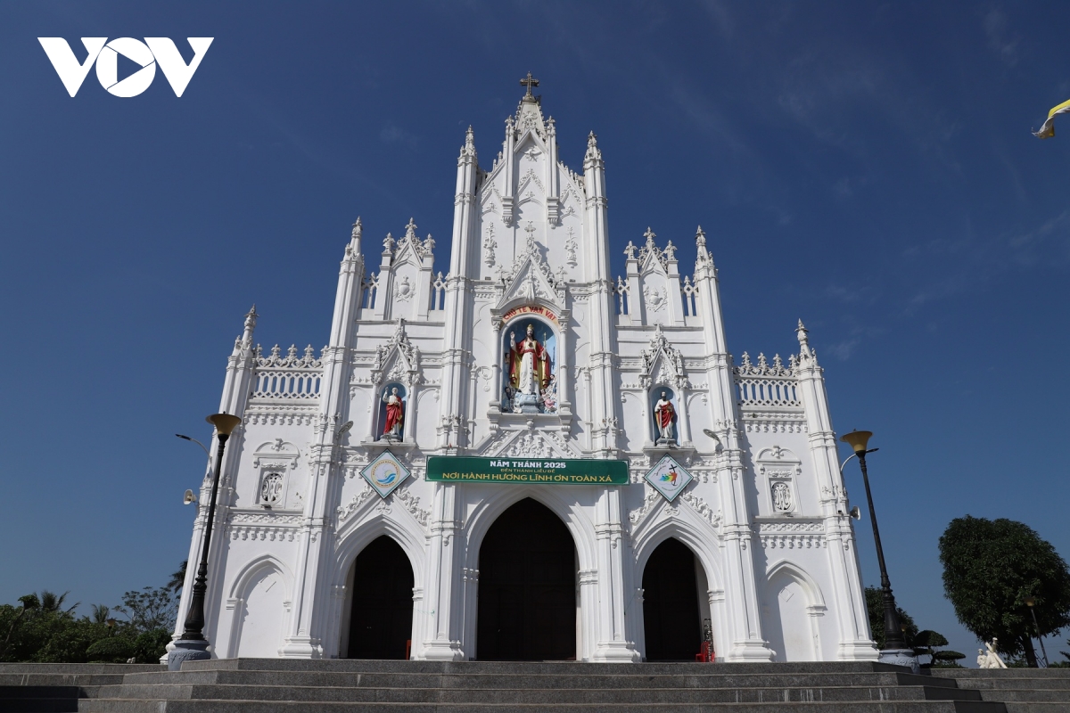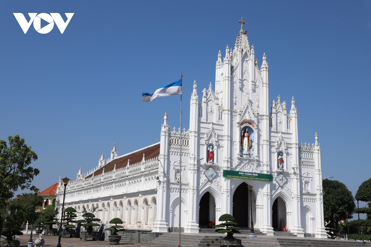 Không gian kiến trúc bên hông Đền Thánh Liễu Đề, nơi nổi bật các đường vòm cong và hoa văn mang đậm phong cách Công giáo truyền thống.