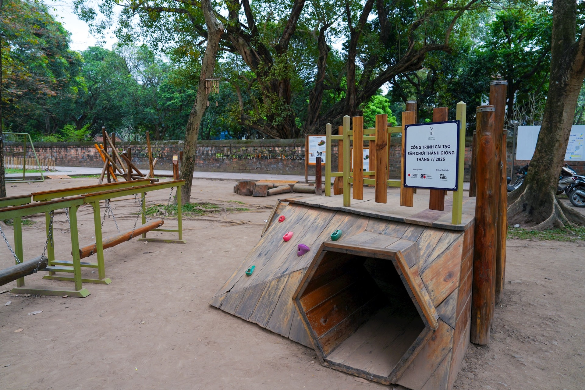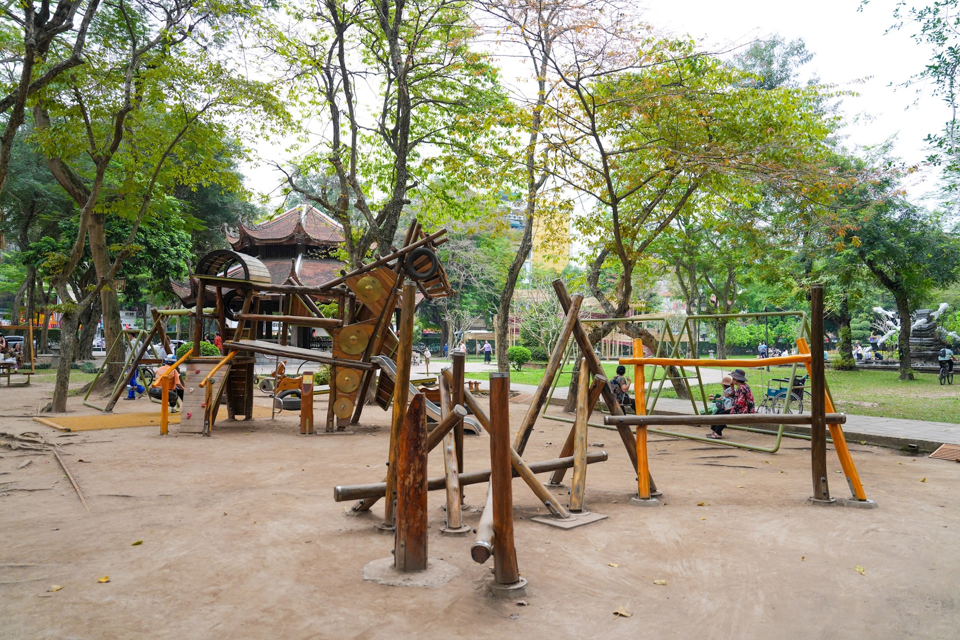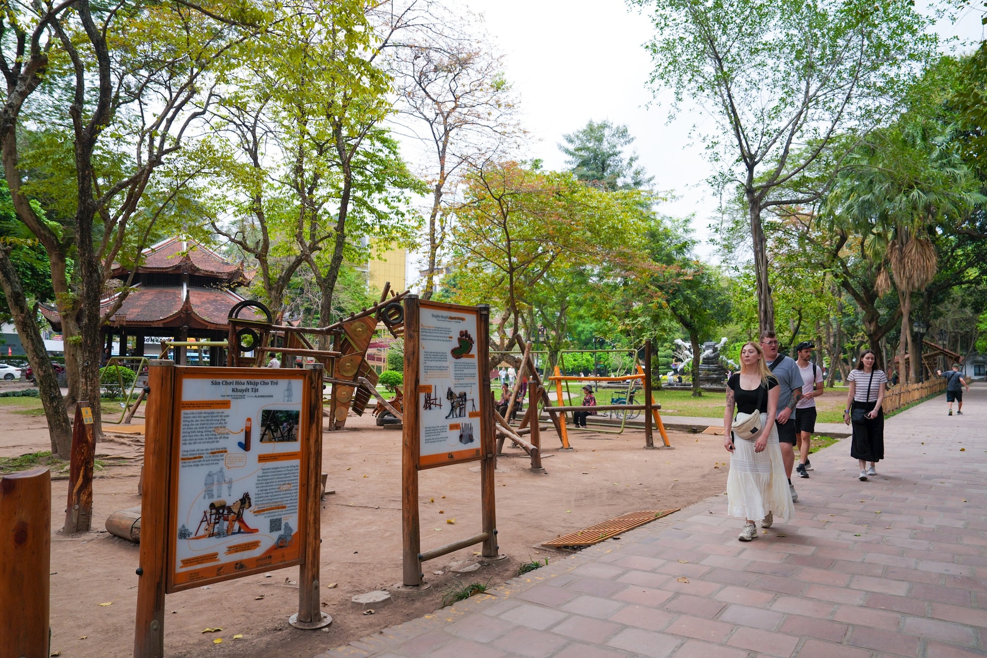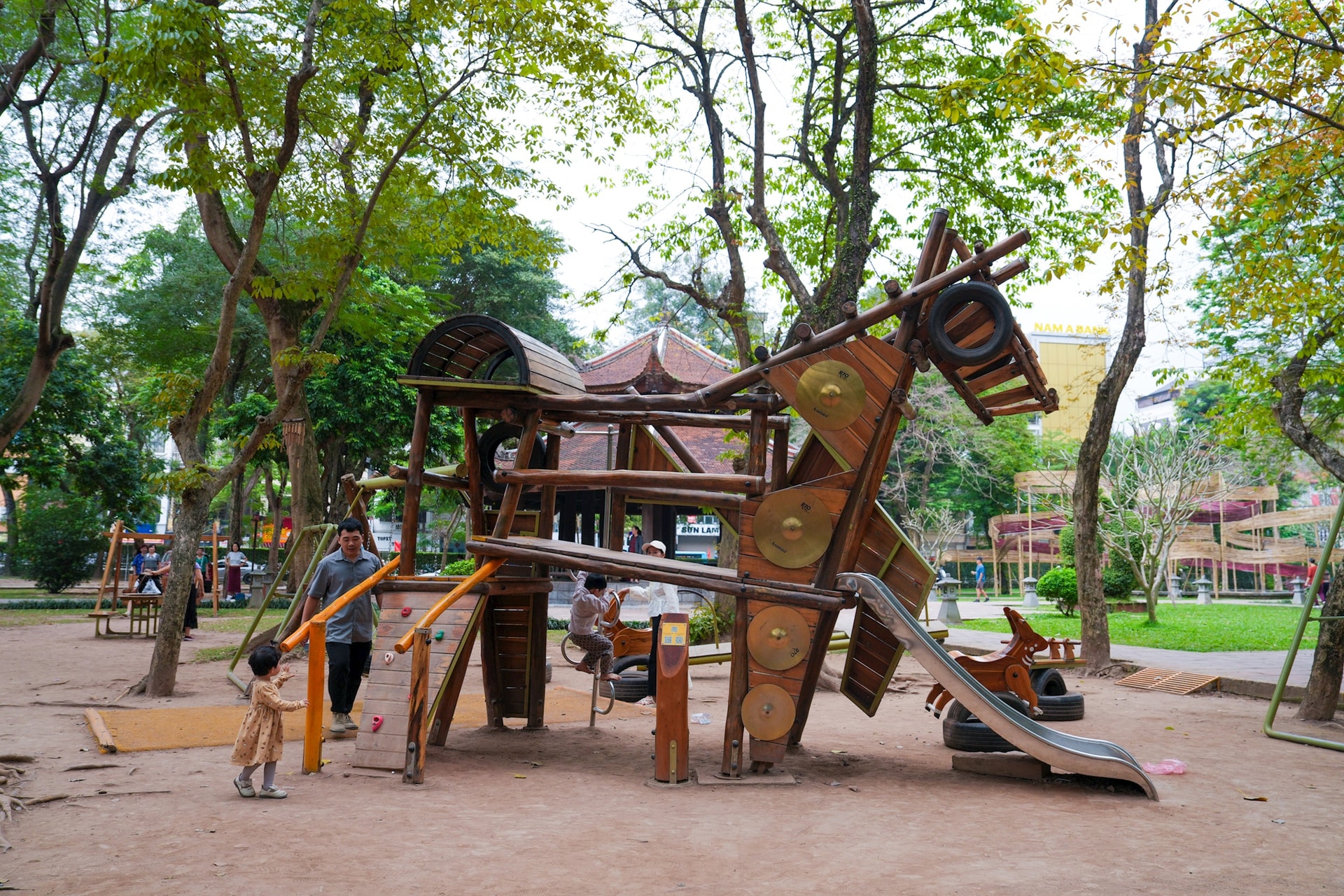 Toàn cảnh sân chơi Thánh Gióng được lắp đặt tại Vườn Giám – không gian xanh nằm trong quần thể Văn Miếu – Quốc Tử Giám, nơi giao thoa giữa di sản và đời sống đô thị.