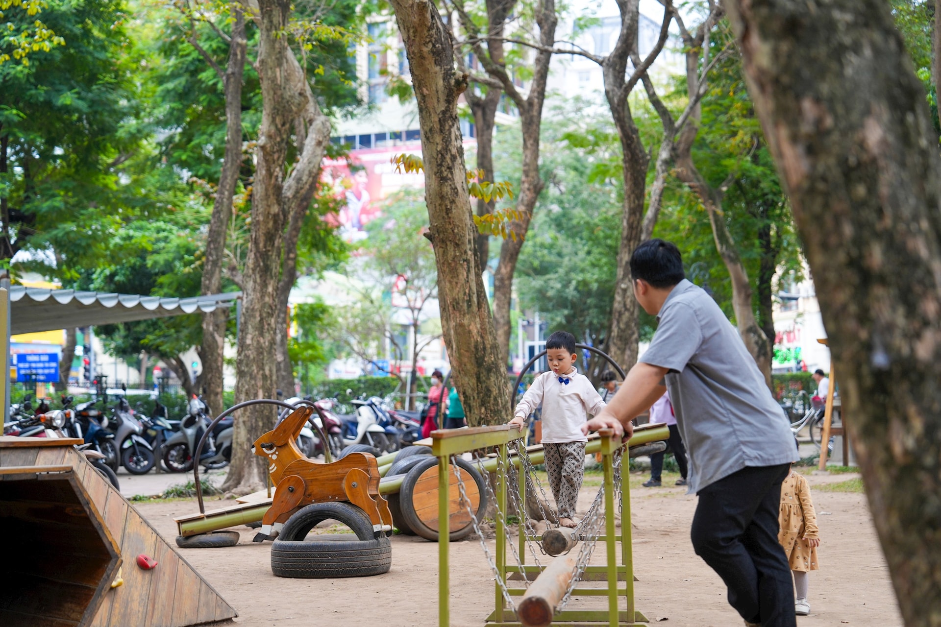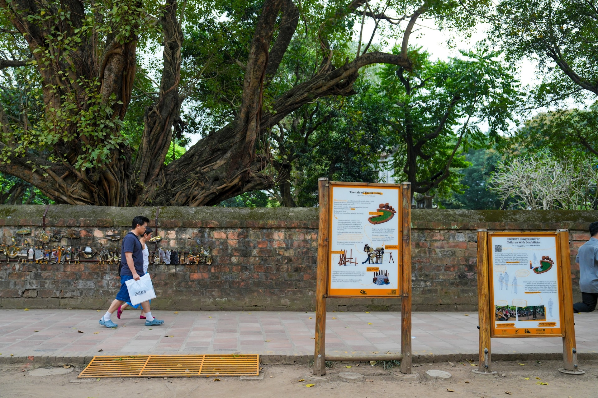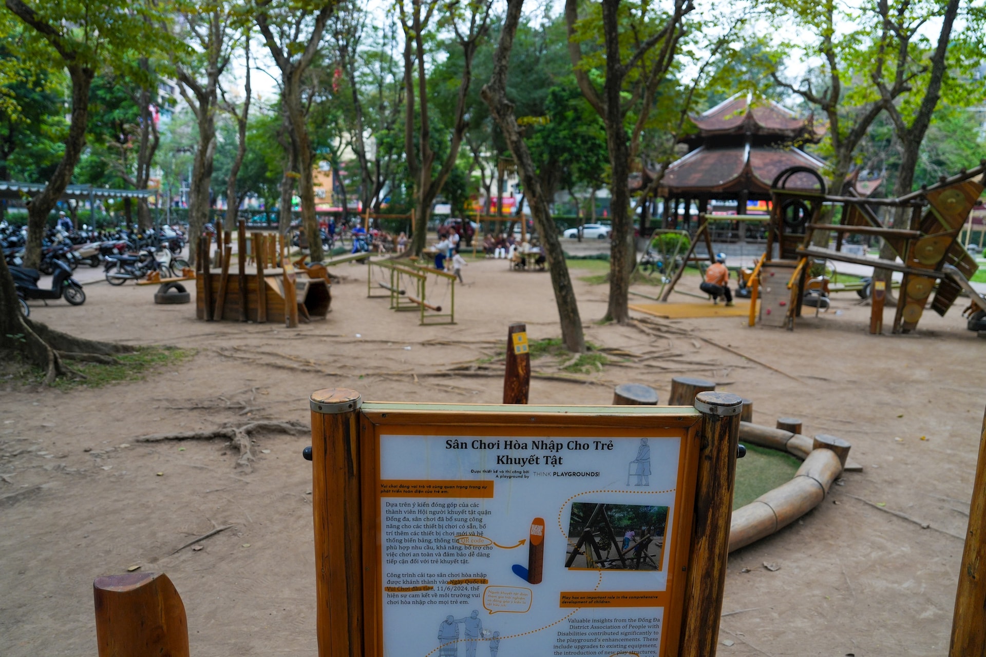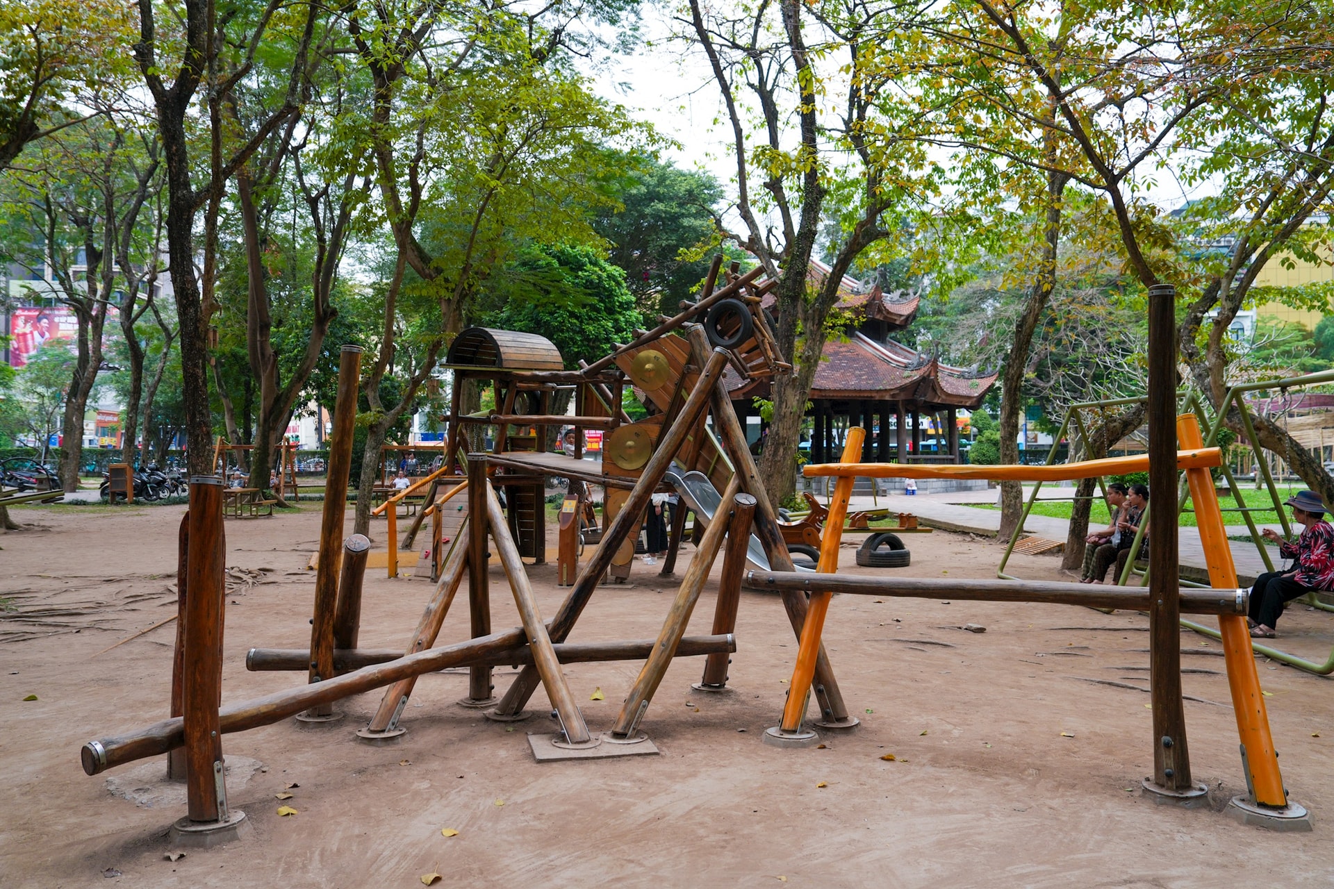 Toàn cảnh sân chơi Thánh Gióng được lắp đặt tại Vườn Giám – không gian xanh nằm trong quần thể Văn Miếu – Quốc Tử Giám, nơi giao thoa giữa di sản và đời sống đô thị.