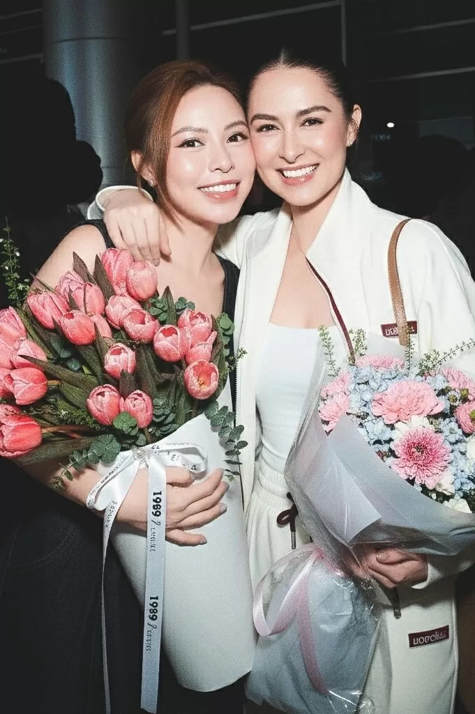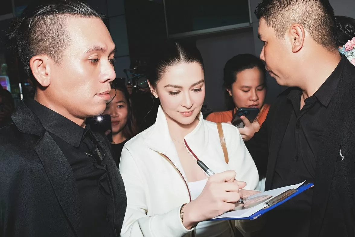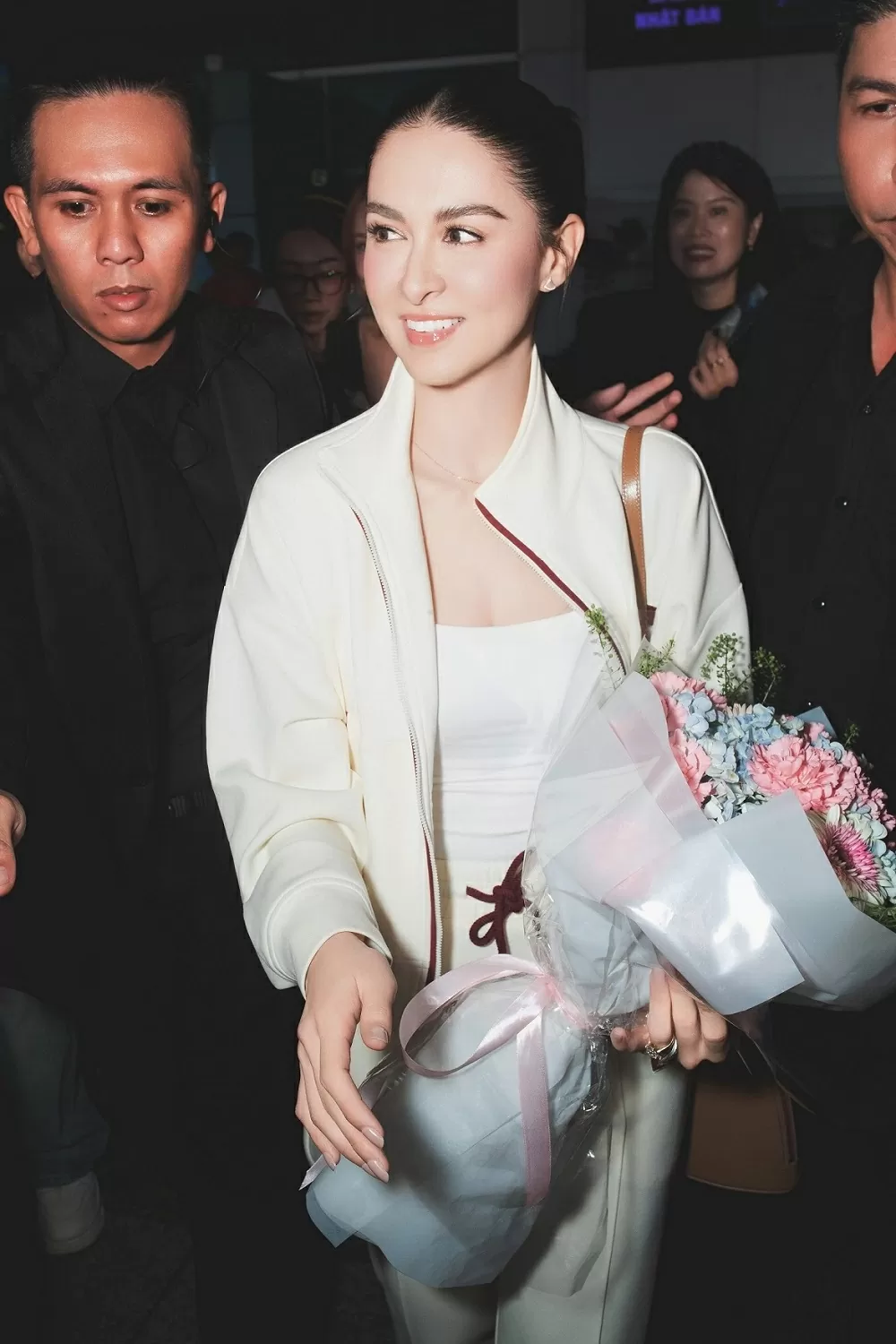 Sau khi hạ cánh ở sân bay Tân Sơn Nhất, Marian Rivera xuất hiện cùng bộ trang phục thể thao khỏe khoắn, khuôn mặt rạng rỡ. Cô nở nụ cười tươi khi thấy có nhiều khán giả Việt Nam đang chờ đón.