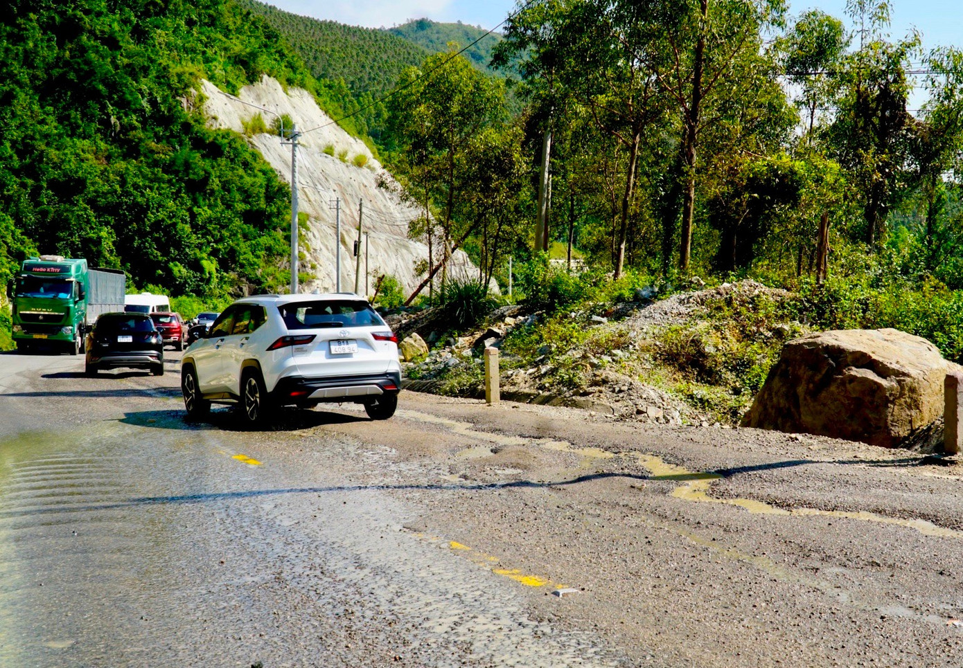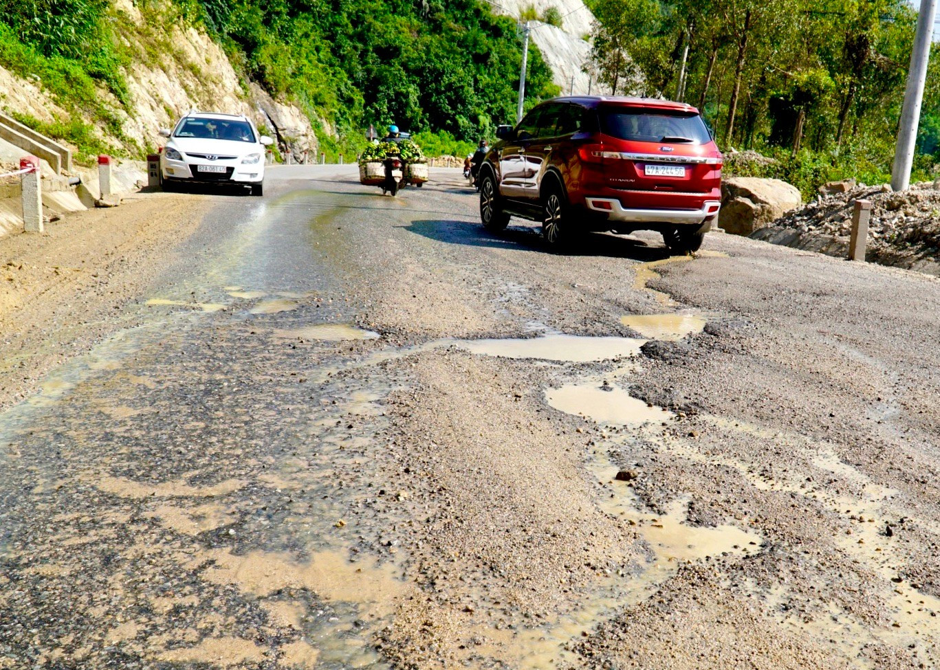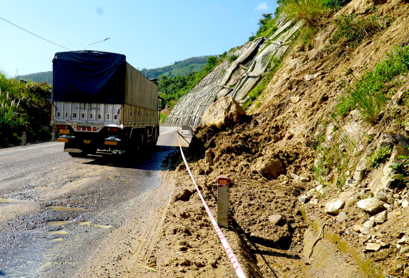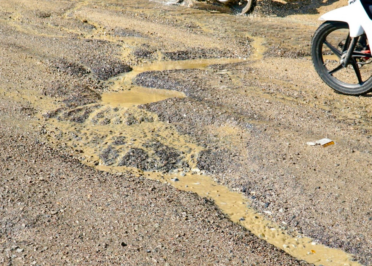 Trong khi đó, qua ghi nhận của phóng viên ngày 8/1, tại nhiều vị trí trên đỉnh và sườn đèo An Khê, mặt đường bê tông nhựa bị bong tróc, đất đá từ taluy dương tràn xuống lòng đường, hình thành các rãnh dài cùng nhiều ổ voi, ổ gà dày đặc. Tình trạng này khiến việc lưu thông trở nên khó khăn, đặc biệt nguy hiểm tại các đoạn khuất tầm nhìn, nơi địa hình đèo dốc có độ dốc lớn.