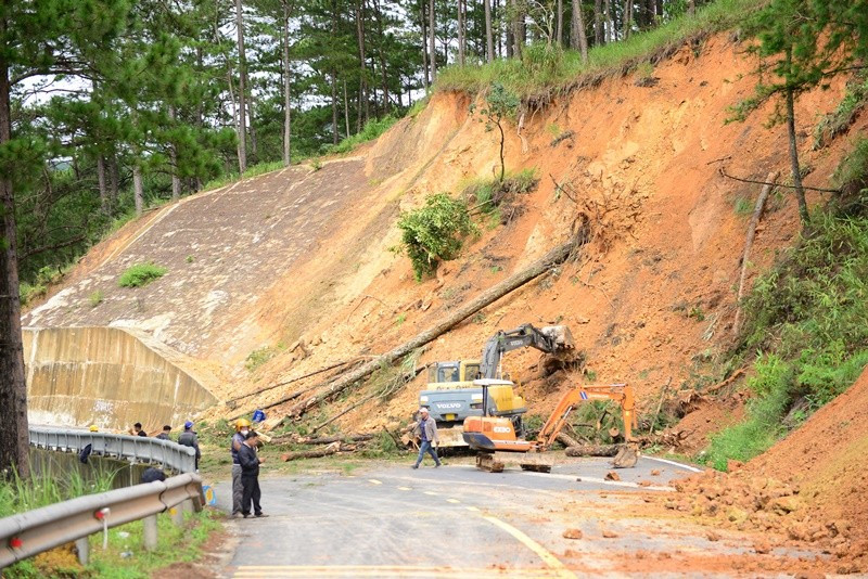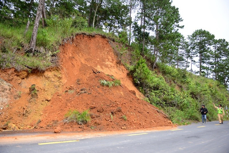 Mưa lớn kéo dài nhiều ngày qua khiến nền đất khu vực đèo D’ran (phường Xuân Trường – Đà Lạt, Lâm Đồng) bị bão hòa nước. Đêm 28/10, hàng tấn đất đá cùng nhiều cây thông cổ thụ bất ngờ sạt xuống mặt đường, làm tê liệt hoàn toàn tuyến quốc lộ 20 qua khu vực Cầu Treo.