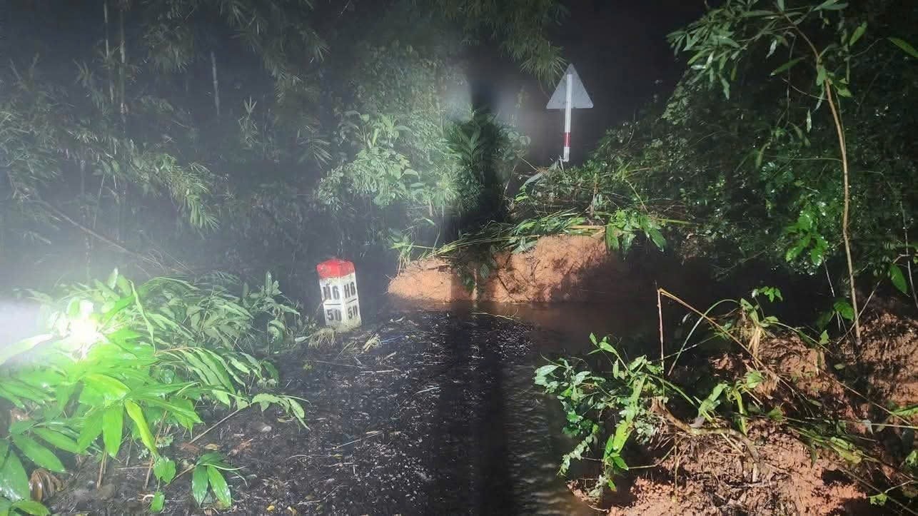 Trong đó, điểm sạt lở tại Km50 khá nặng khi cả đất, cây đổ chắn ngang hoàn toàn mặt đường.