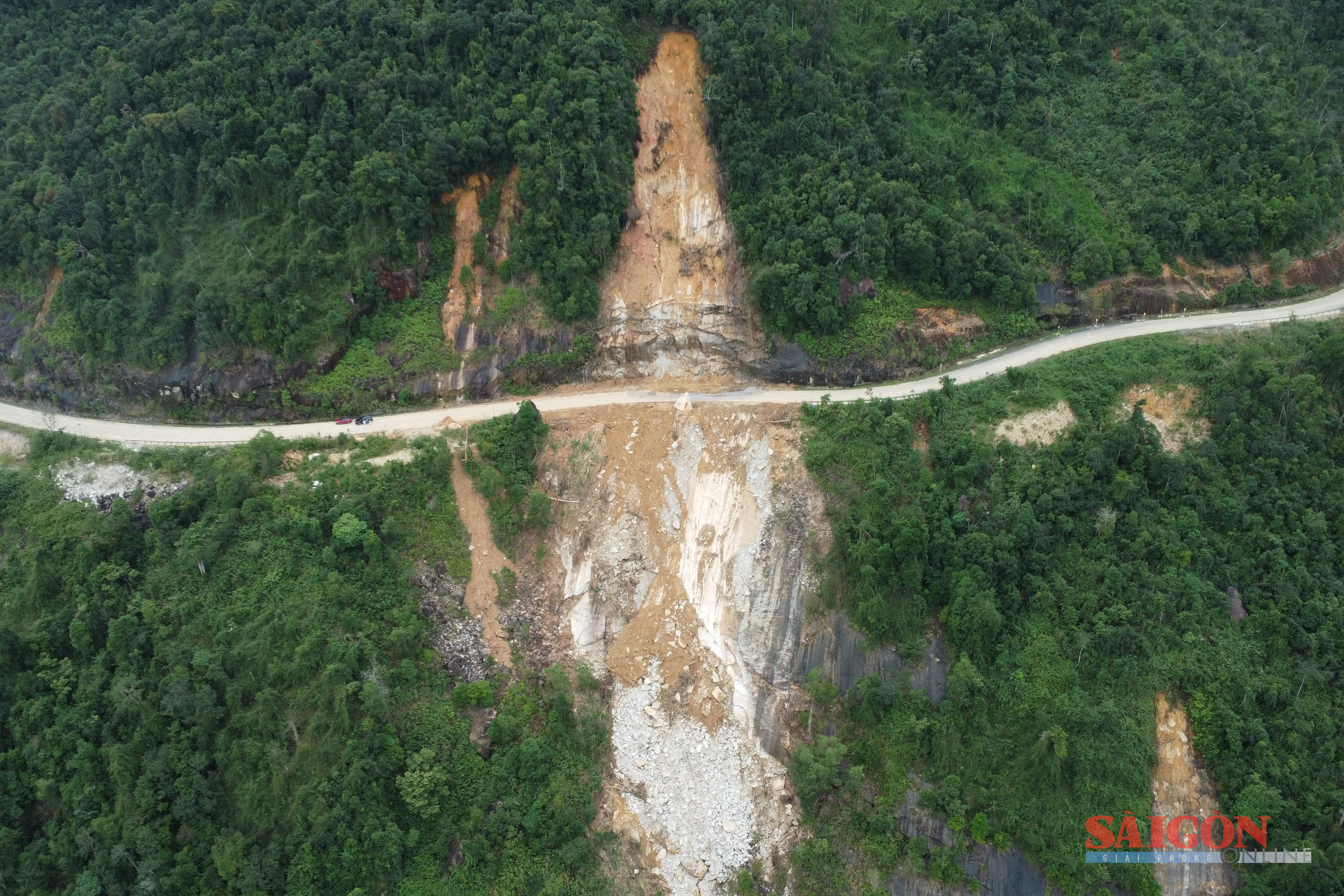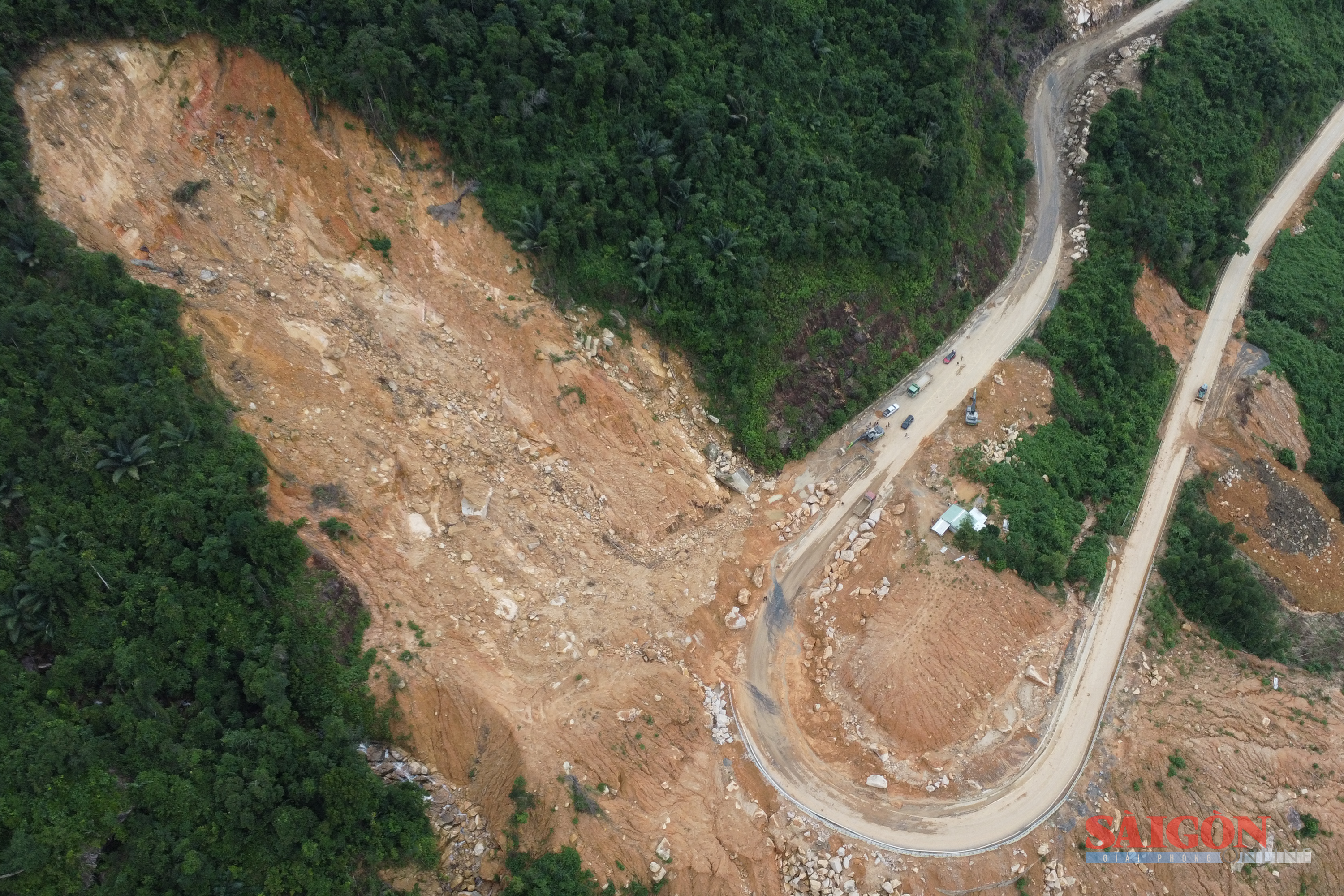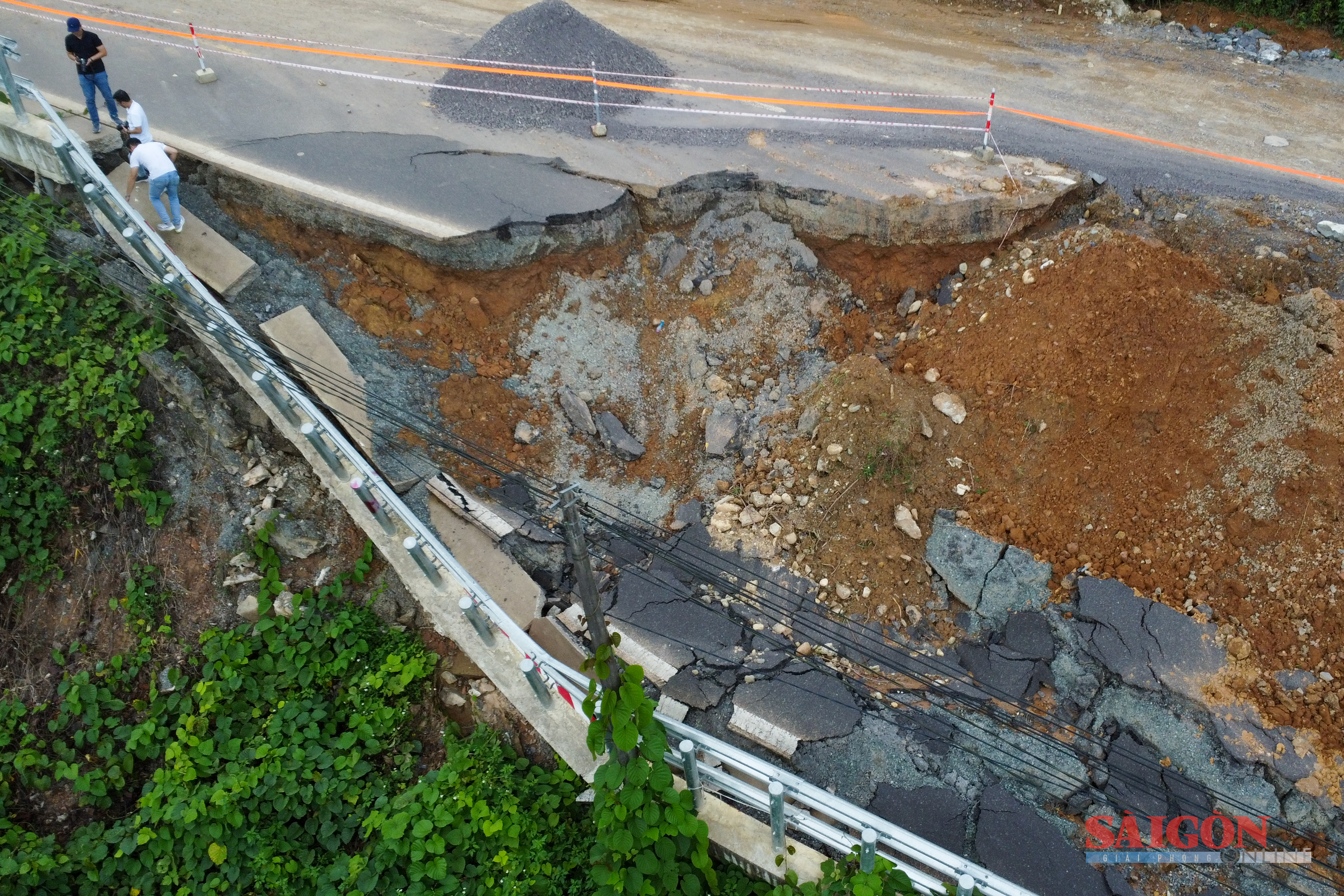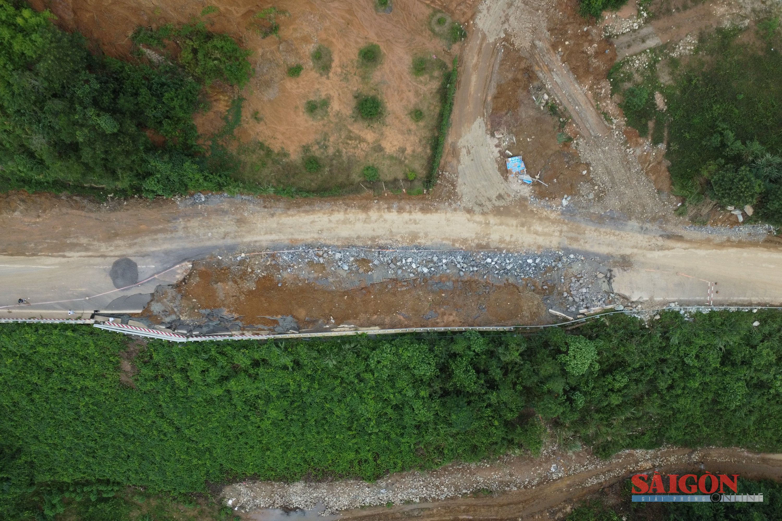 Tại Km36+700, mặt đường sụt sâu hơn 5m, nứt dài hơn 100m, đơn vị thi công phải khoanh vùng cảnh báo. Hiện khu vực đèo có nhiều mạch nước chảy âm ỉ trong núi, lực lượng chức năng buộc phải theo dõi, kiểm tra liên tục.