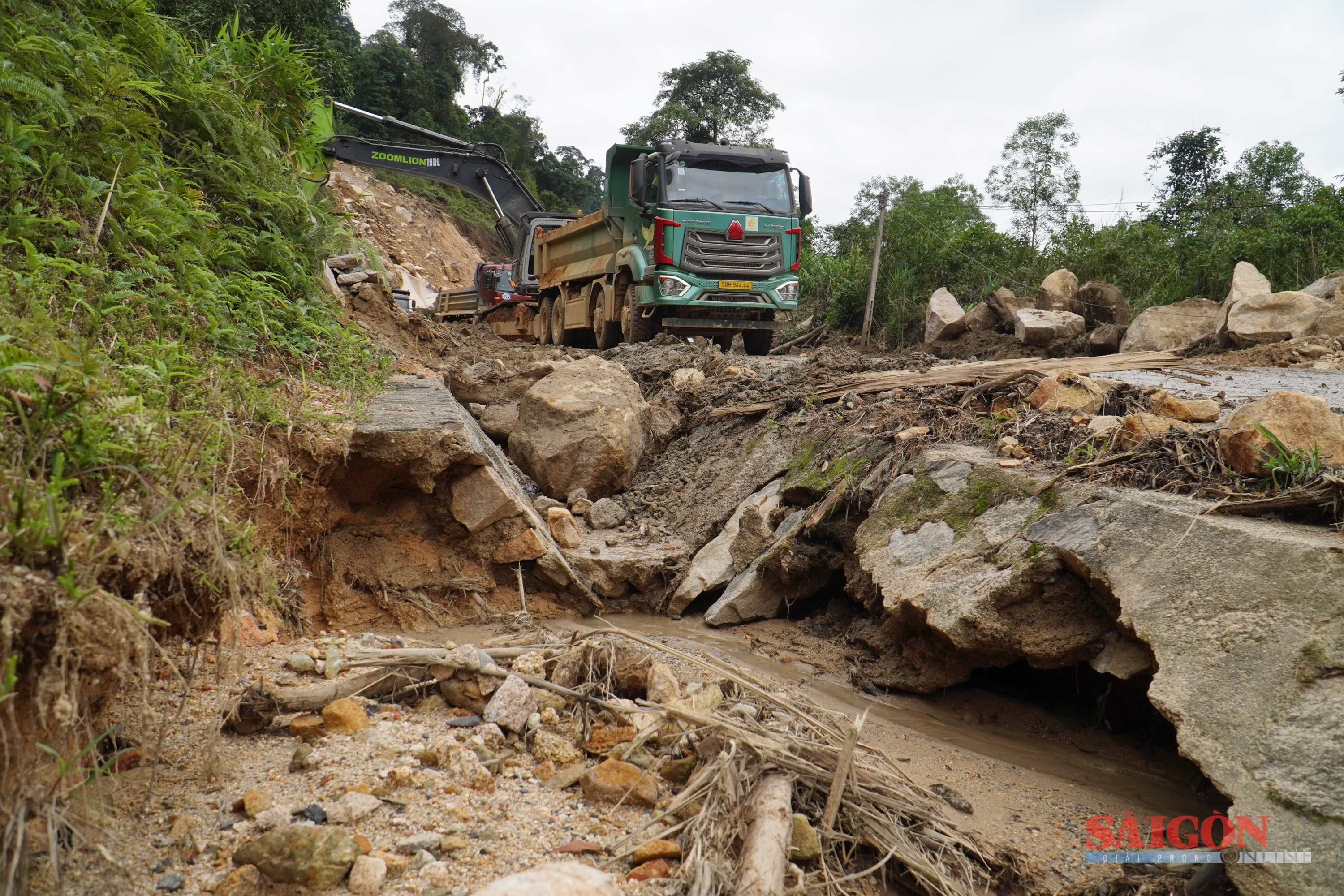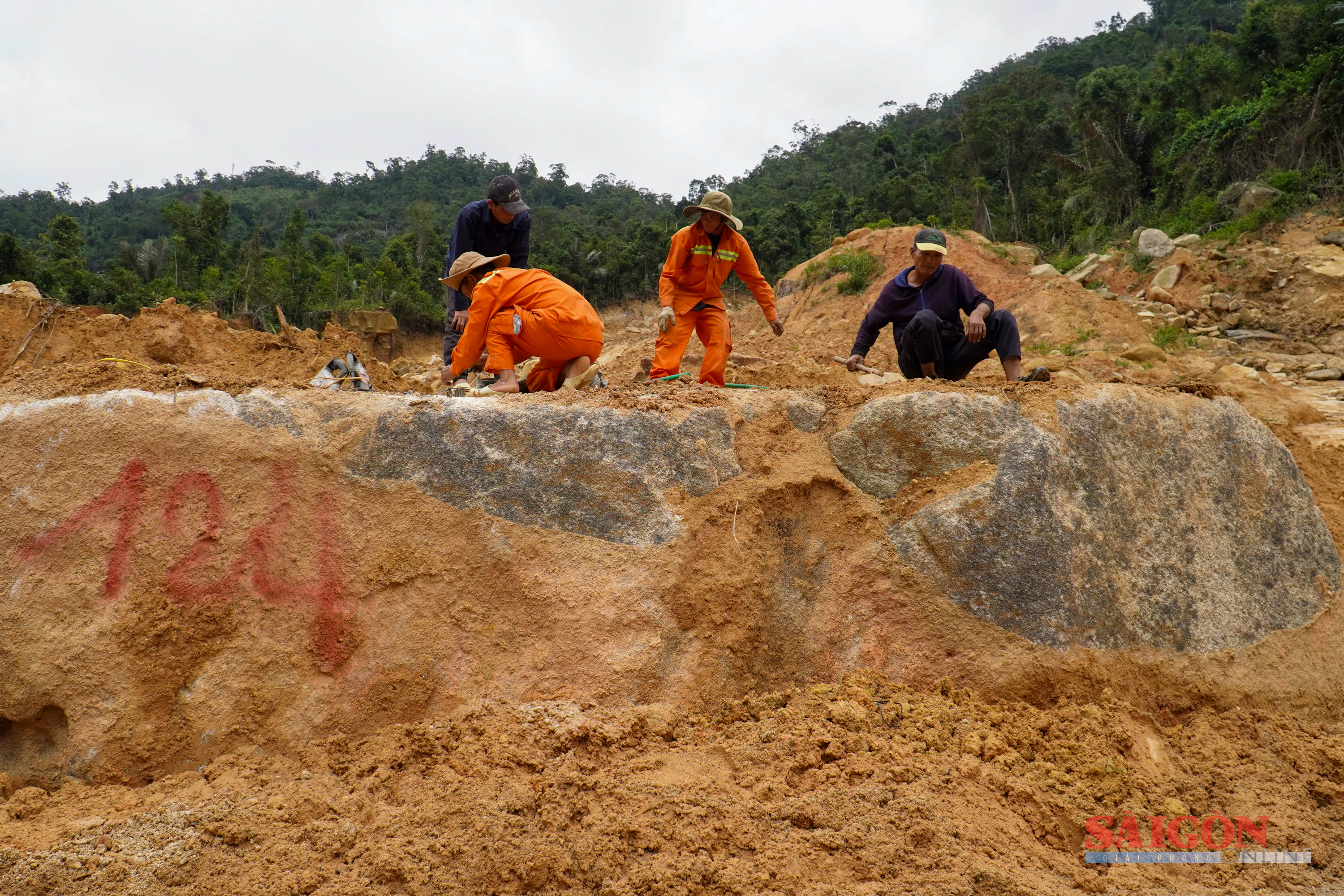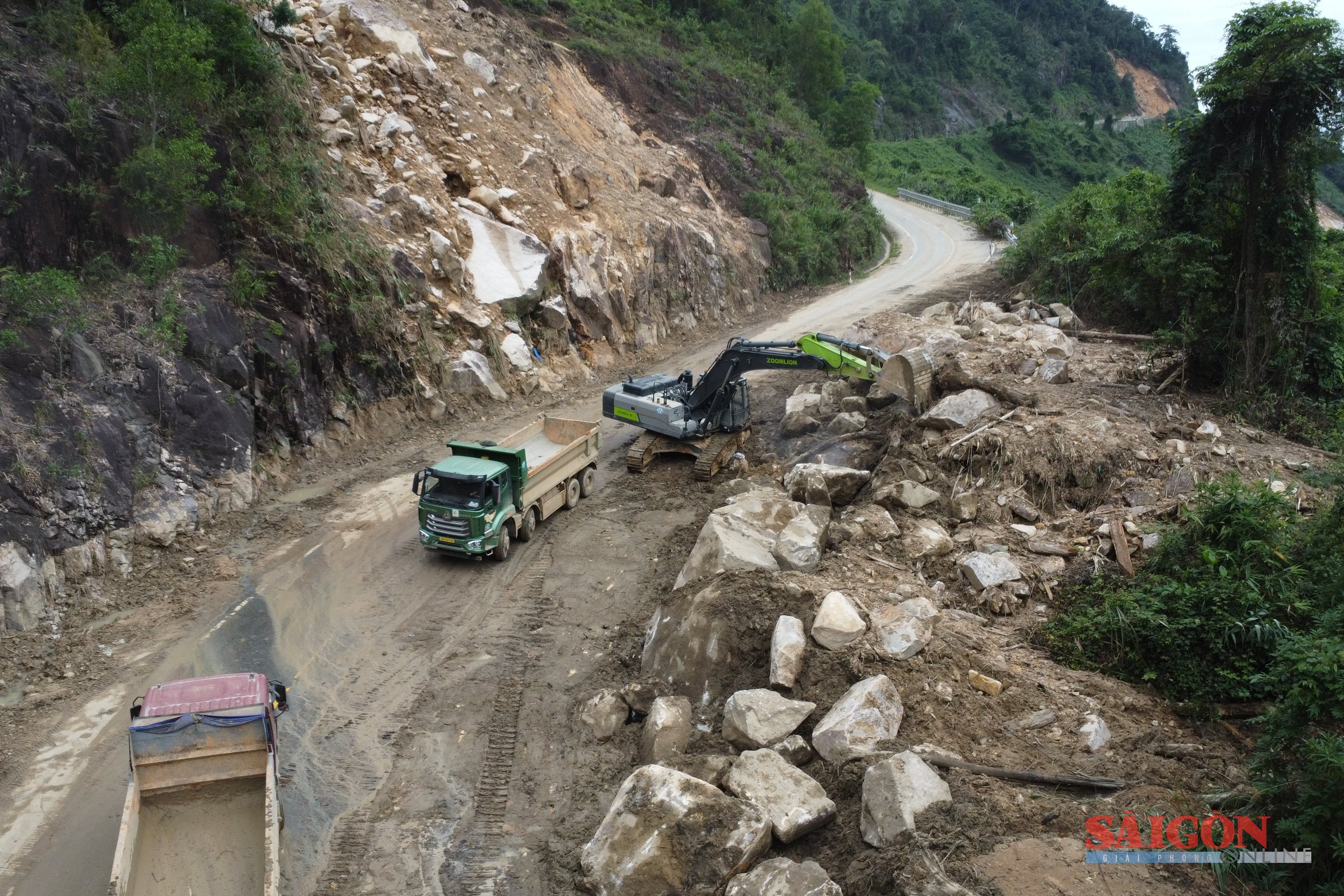 Những khối đá nặng hàng trăm tấn lăn xuống chắn ngang đường, lực lượng chức năng phải nổ mìn. Tiến độ bị ảnh hưởng vì sau khi phá được một điểm, công nhân phải dọn xong mới phá được điểm khác.