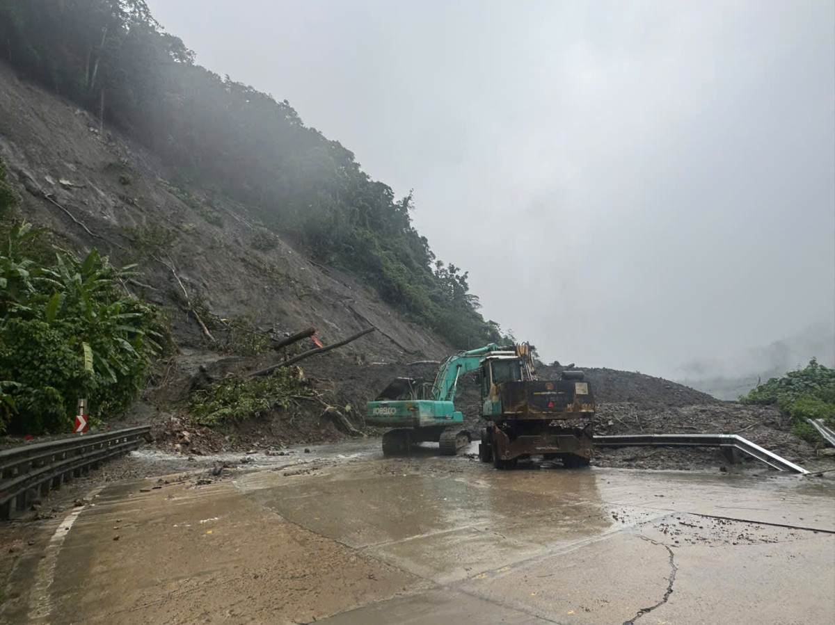 Lực lượng chức năng đang huy động máy móc xử lý các điểm sạt lở trên tuyến.