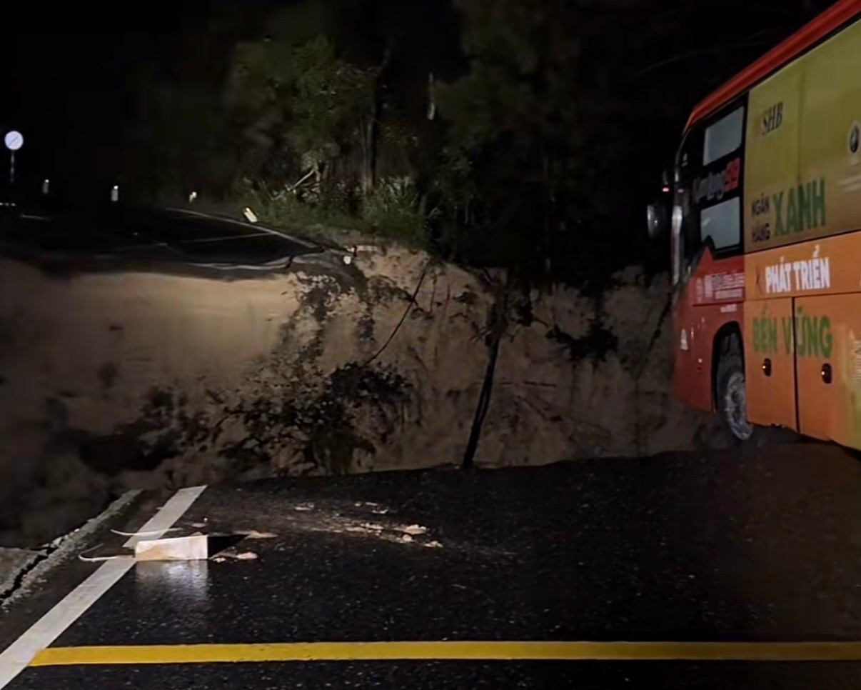 Một xe khách 45 chỗ kịp dừng ngay mép sạt lở.
