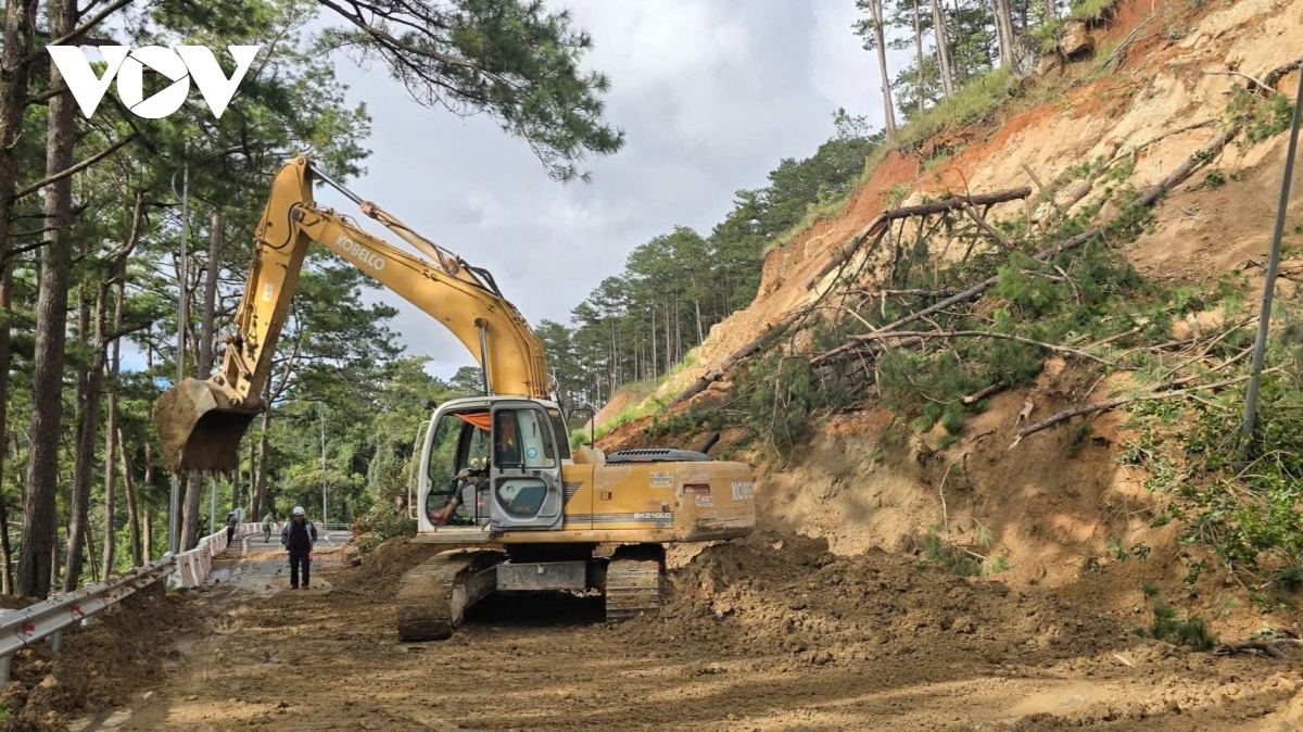 Từ tối 4/12 đến rạng sáng 5/12, Ban Quản lý dự án Đầu tư xây dựng số 1 tỉnh Lâm Đồng cùng đơn vị thi công đã huy động máy móc, nhân lực thu dọn lượng lớn đất đá, cây cối sạt xuống mặt đường tại vị trí Km224+600 – Km224+700. Đồng thời, đơn vị chủ rừng tiến hành cưa hạ những cây thông có dấu hiệu bật gốc, nguy cơ đổ vào đường.
