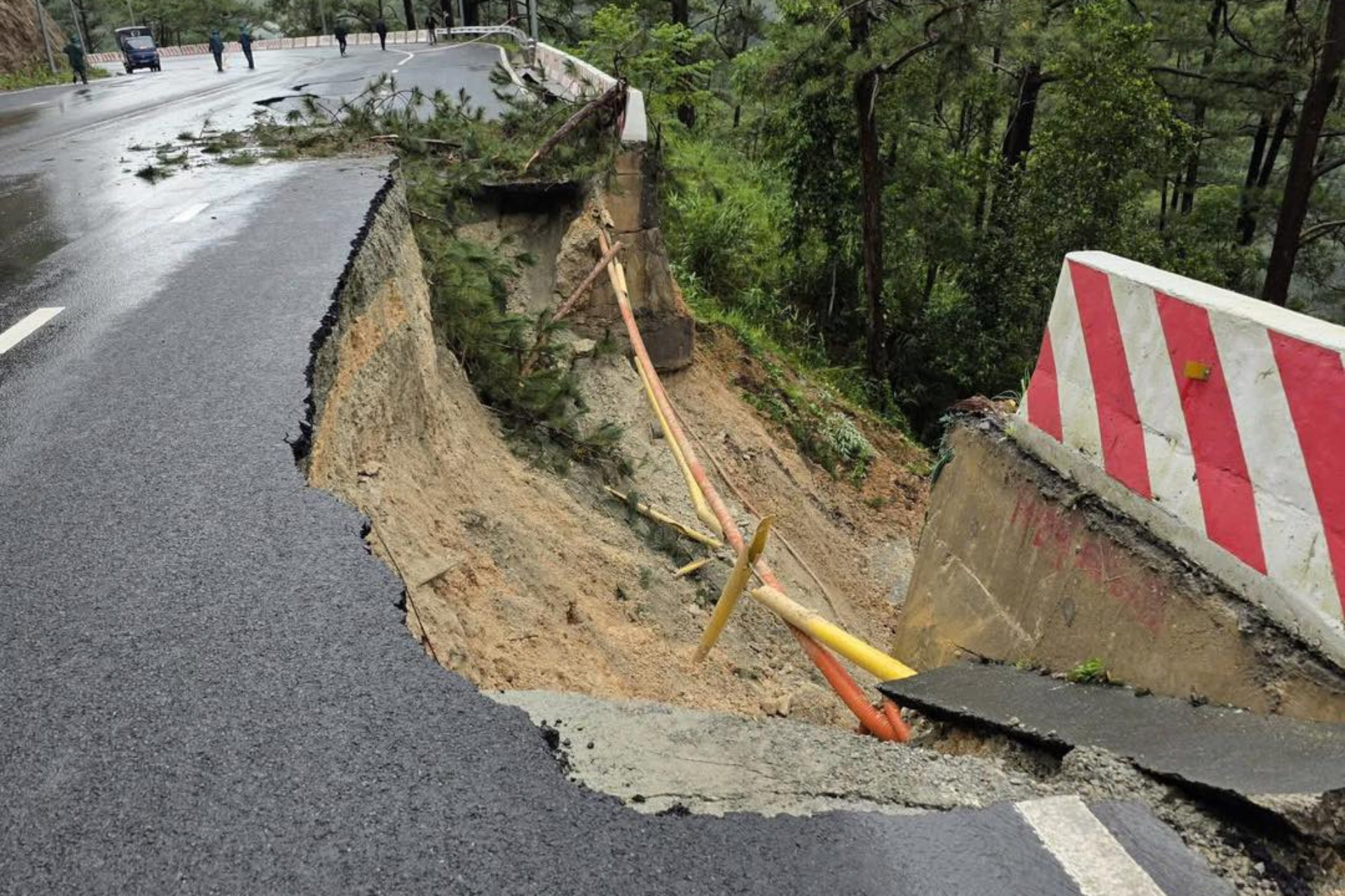 Theo thông tin ban đầu, mưa lớn sáng nay khiến một mảng lớn mặt đường đèo Prenn dài hơn 10m sạt trôi hoàn toàn xuống rừng thông bên dưới. Nửa mặt đường còn lại xuất hiện nhiều vết nứt kéo dài, tiềm ẩn nguy cơ sạt lở tiếp theo.