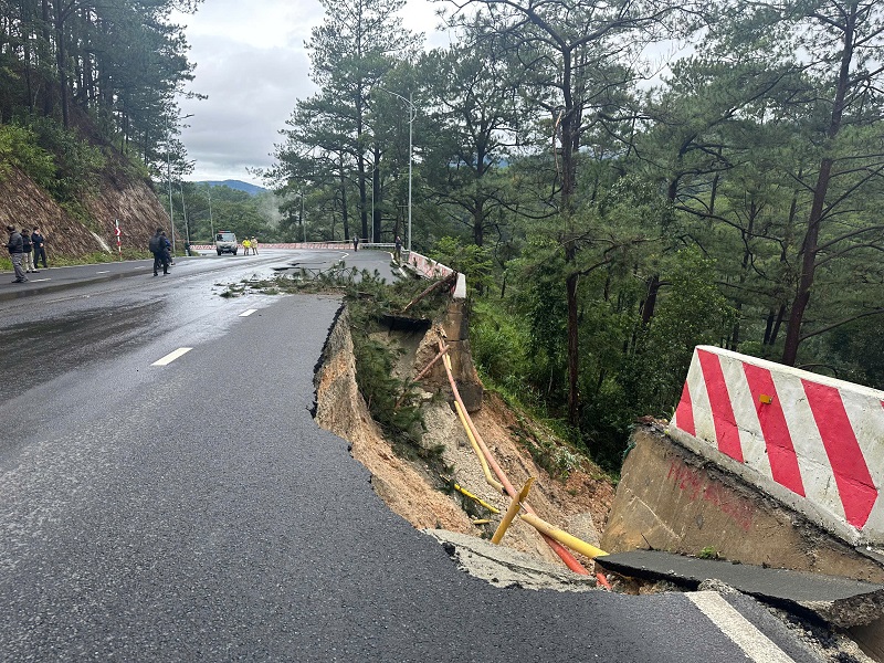 Theo đó, do ảnh hưởng các đợt mưa lớn, kéo dài từ tối ngày 15/11/2025 đến sáng ngày 17/11/2025 dẫn đến vào lúc 9 giờ 00 ngày 17/11/2025, trên tuyến đường đèo Prenn hướng từ Đà Lạt đi thành phố Hồ Chí Minh đoạn từ Km224+600 - Km224+700 dài khoảng 100m, đã xảy ra sạt lở khoảng 7,5m bề rộng mặt đường và tường chắn taluy âm, có nguy cơ tiếp tục xảy ra sạt lở nếu không kịp thời có biện pháp ứng phó khẩn cấp.
