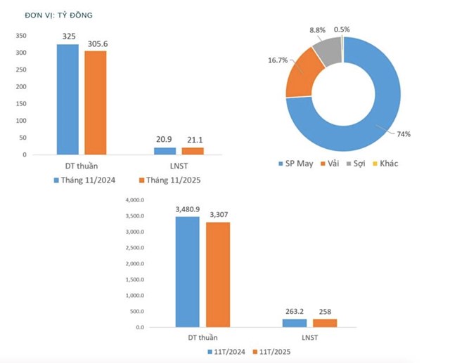 Trong cơ cấu doanh thu tháng, mảng may tiếp tục giữ vai trò chủ lực, chiếm 74% tổng doanh thu. Mảng vải đóng góp 16,7% và mảng sợi chiếm 8,8%.