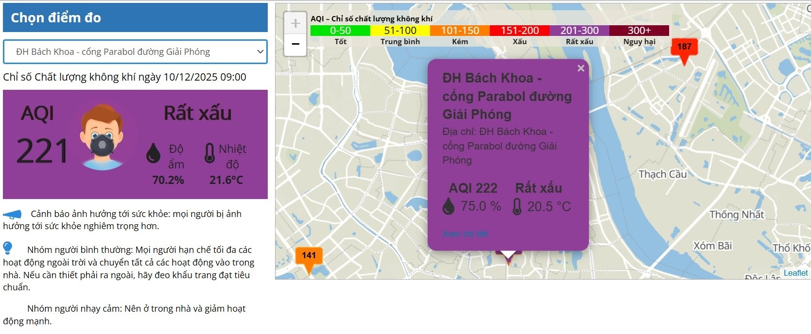 Sáng 10/12, chỉ số chất lượng không khí (AQI) đo tại khu vực cổng Parabol của ĐH Bách khoa Hà Nội (nằm trên đường Giải Phóng) ghi nhận ở mức cao nhất lên đến 222, thuộc nhóm rất xấu. Đây là ngưỡng gây ảnh hưởng nghiêm trọng tới sức khỏe toàn bộ người dân.