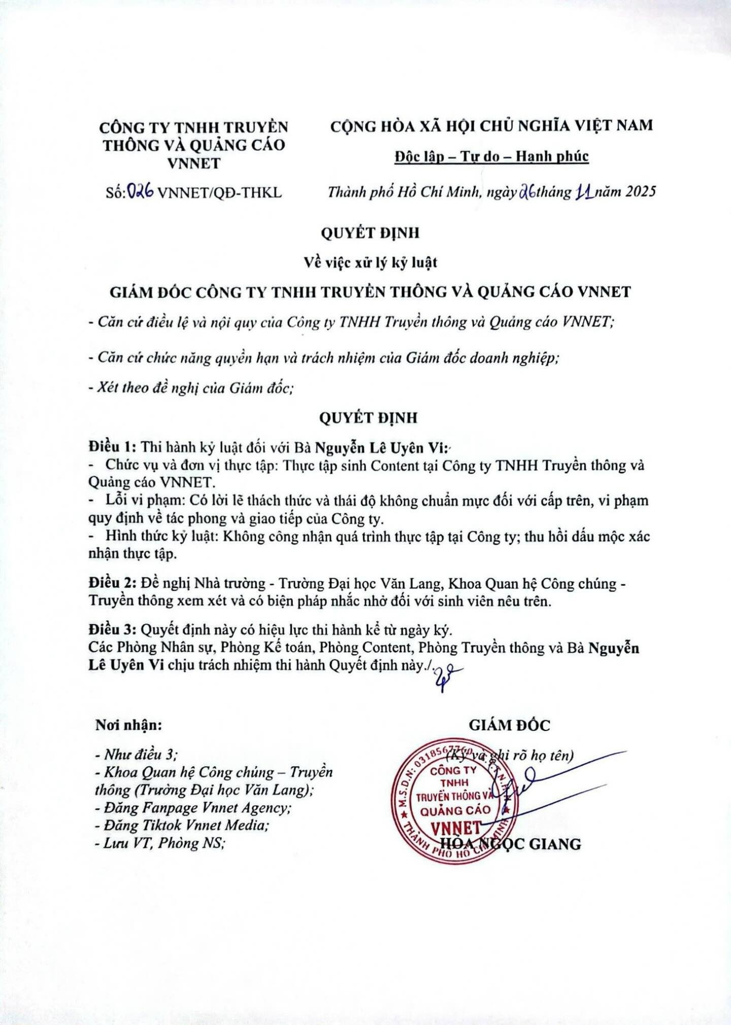 Hình thức kỷ luật được doanh nghiệp áp dụng gồm không công nhận toàn bộ quá trình thực tập và thu hồi dấu mộc cùng giá trị pháp lý của giấy xác nhận đã cấp trước đó. Theo phía công ty, đây là quyết định được đề nghị và ký duyệt trực tiếp bởi giám đốc.