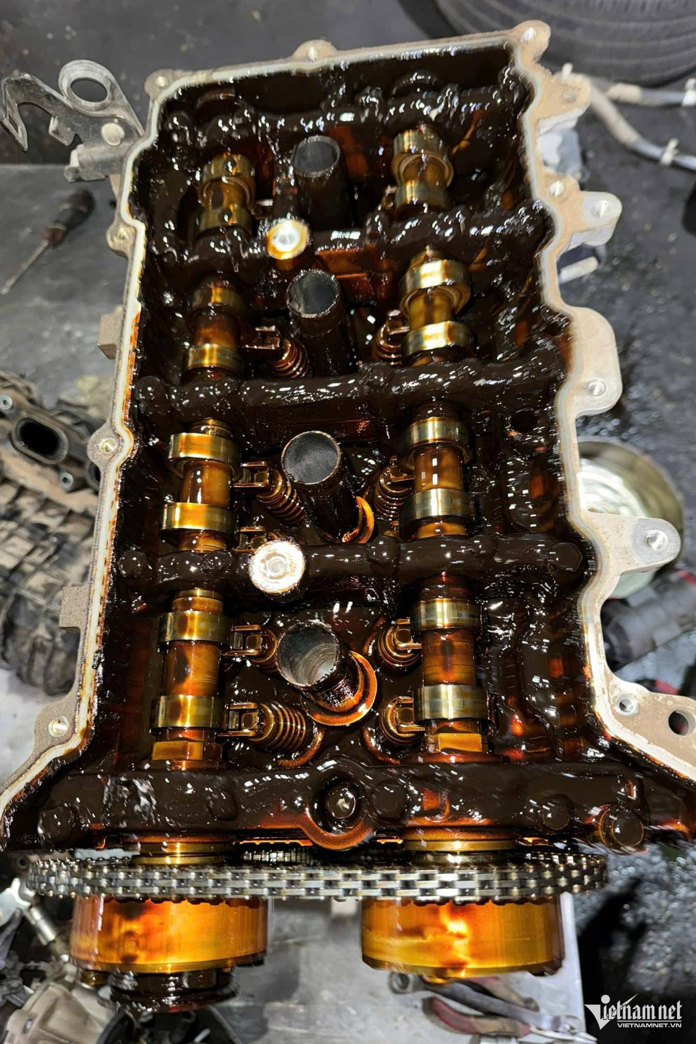Được sự đồng ý của anh T., phía gara đã quyết định đại tu toàn bộ phần động cơ. Khi "bổ máy", cả chủ xe cũng như các kỹ thuật viên đều tá hỏa khi toàn bộ bộ phận bên trong dầu máy bám đặc như...socola, có những vị trí bị cháy đen, đặc quánh. Các chi tiết như trục cam, bạc biên, xu-páp chịu mài mòn nặng đến mức không thể khắc phục.