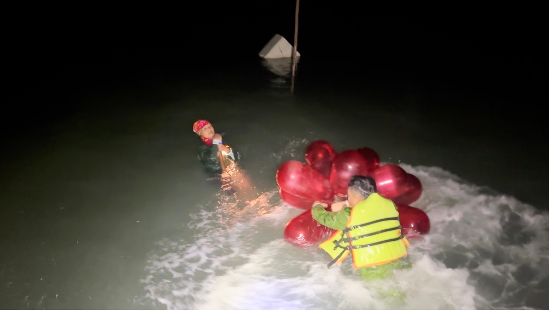 Đến 4h40 ngày 25/11, lực lượng chức năng tìm thấy hai nạn nhân trong tình trạng nguy kịch, đang phải ôm đỉnh cọc hơn 6 tiếng đồng hồ khi thủy triều dâng lên hơn 3m tại khu vực Cỏ Gà, luồng Hà Cối.
