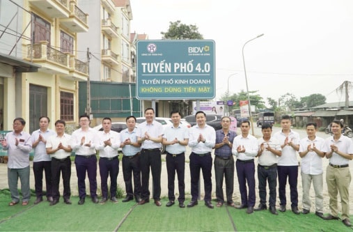Các đồng chí lãnh đạo xã và đại biểu thực hiện nghi thức ra mắt “Tuyến phố 4.0, tuyến phố kinh doanh không dùng tiền mặt”.