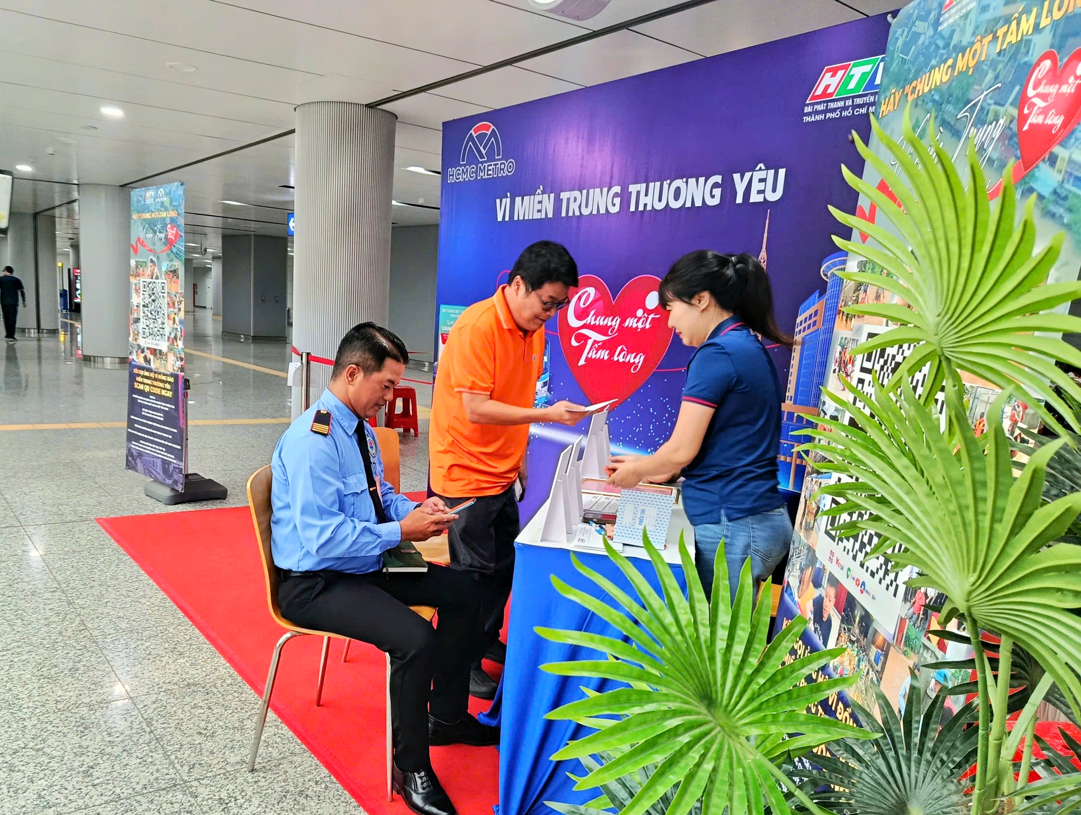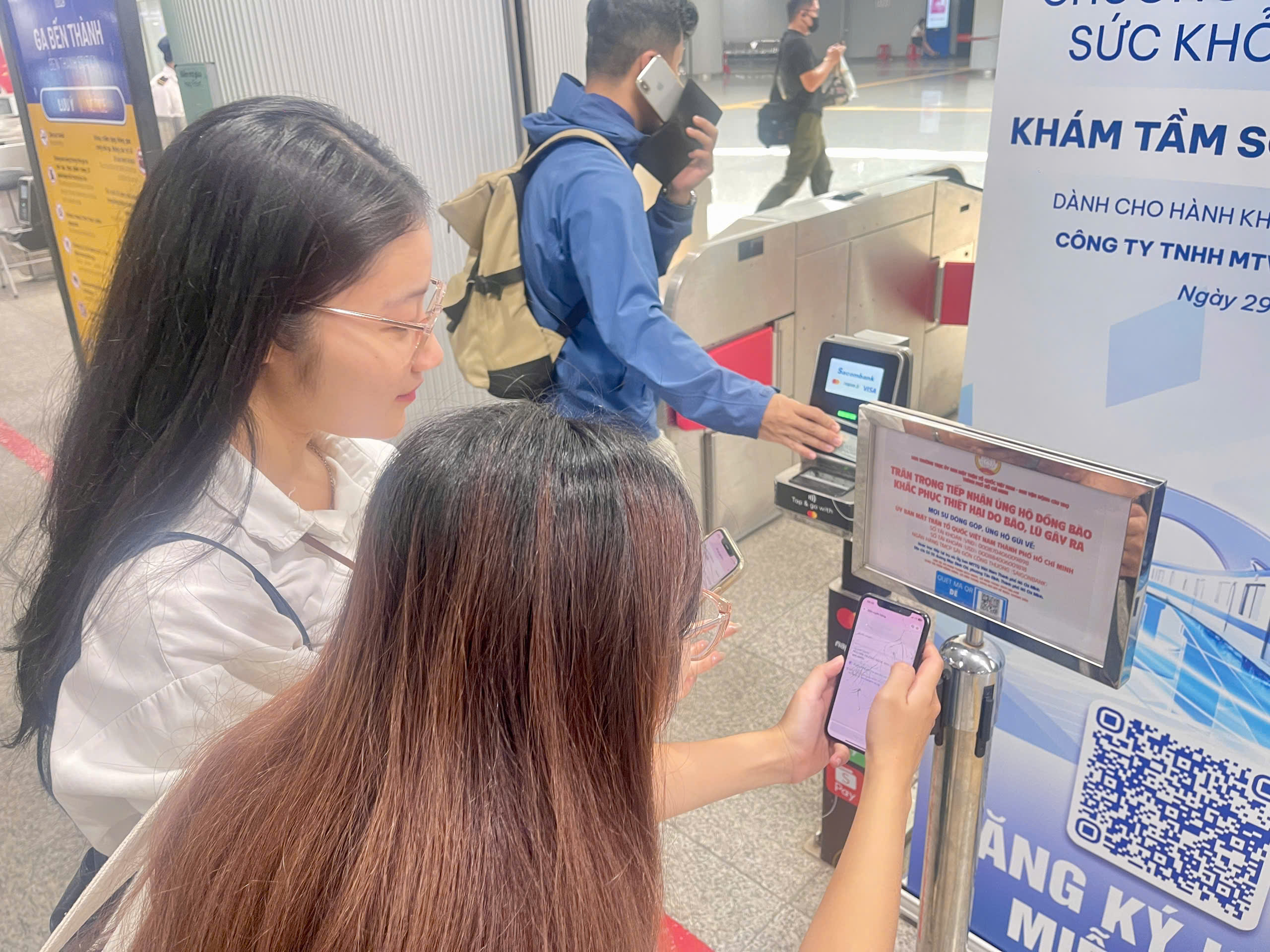 Ngày 26-11, tại các nhà ga của tuyến metro số 1 (Bến Thành - Suối Tiên), hành khách dễ dàng bắt gặp các banner thông báo tiếp nhận ủng hộ đồng bào khắc phục hậu quả của bão lũ, với mã QR code ngân hàng của Ủy ban MTTQ Việt Nam TPHCM.