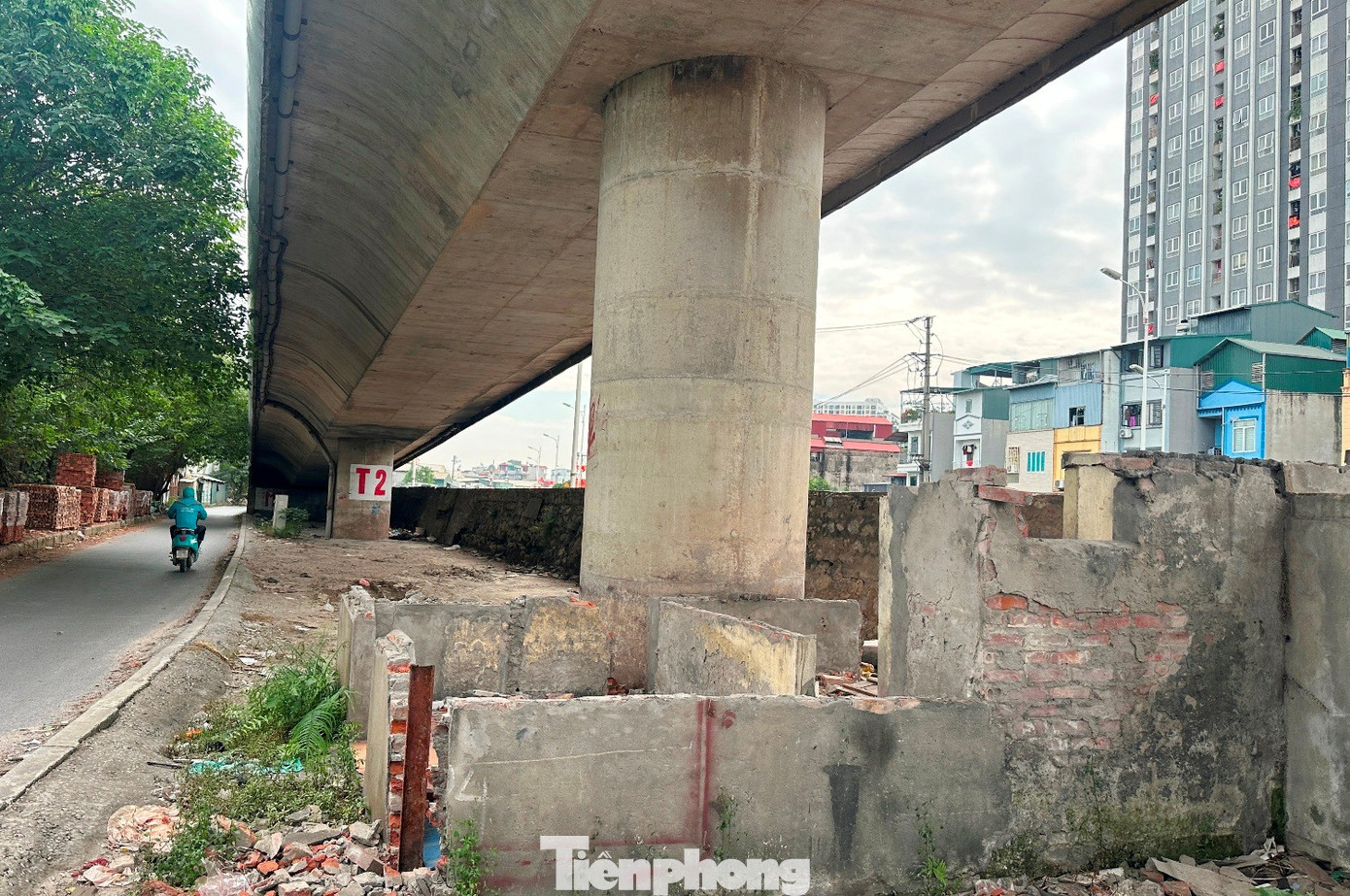 Tại nhánh đường dẫn ở đê Nguyễn Khoái dẫn lên cầu, một số công trình nhà cửa đã được phá dỡ, giải tỏa, nhưng phần móng xây dựng vẫn còn.