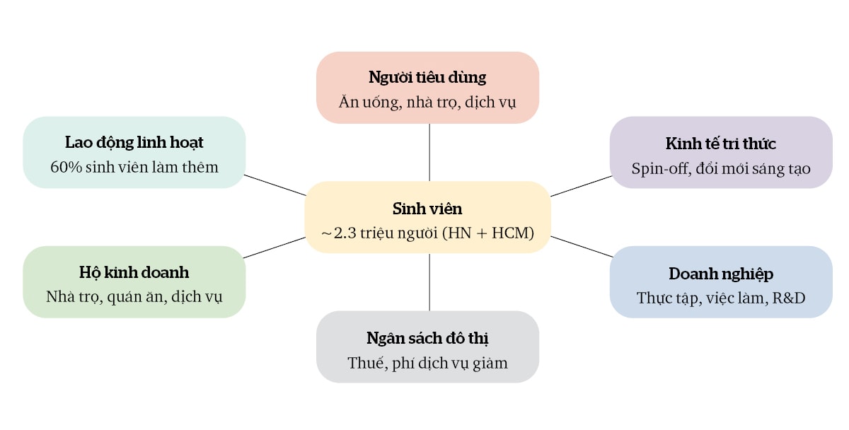 Một trong những sai lầm phổ biến nhất là nhìn sinh viên thuần túy như đối tượng thụ hưởng dịch vụ giáo dục. Trên thực tế, họ đồng thời là một lực lượng kinh tế đặc biệt, vận hành theo nhiều vai trò song song. Trước hết, sinh viên là nhóm tiêu dùng có tần suất cao và ổn định. Không gian tiêu dùng của họ gần như cố định quanh trường học và nơi ở, nhưng danh mục chi tiêu lại trải rộng từ ăn uống, nhà ở, di chuyển cho tới giải trí và viễn thông. Mỗi sinh viên tại đô thị có thể chi từ 3-5 triệu đồng mỗi tháng cho sinh hoạt, chưa kể học phí. Với quy mô khoảng một triệu sinh viên ở Hà Nội và hơn 700.000 tại TP.HCM, dòng tiền tiêu dùng này tạo ra hàng chục nghìn tỷ đồng mỗi năm, trực tiếp nuôi dưỡng kinh tế nội đô.