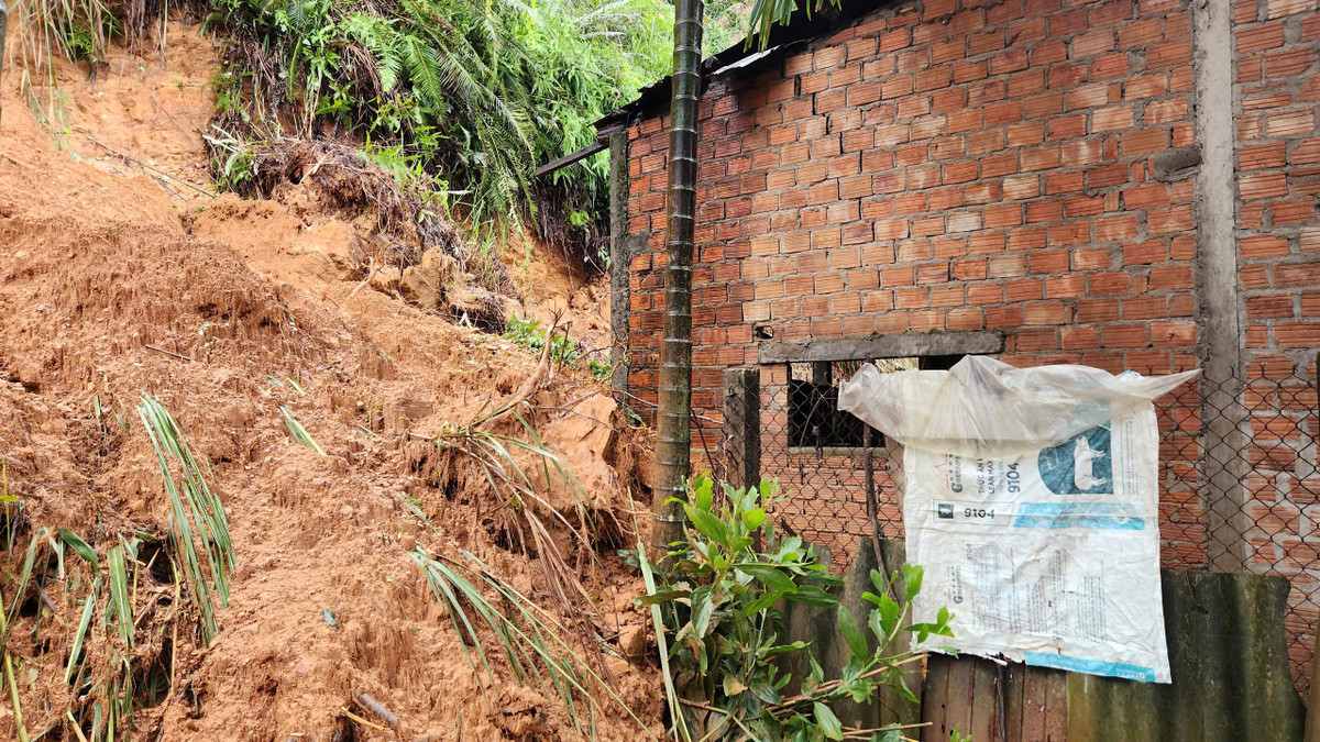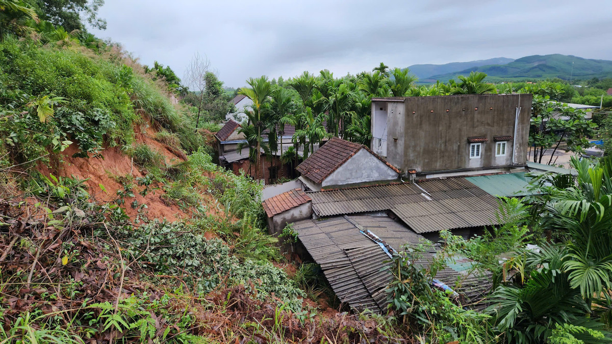 Bùn đất từ trên núi Hòn Dồ sạt đổ áp sát vách nhà các hộ dân tại xã Trường Giang.
