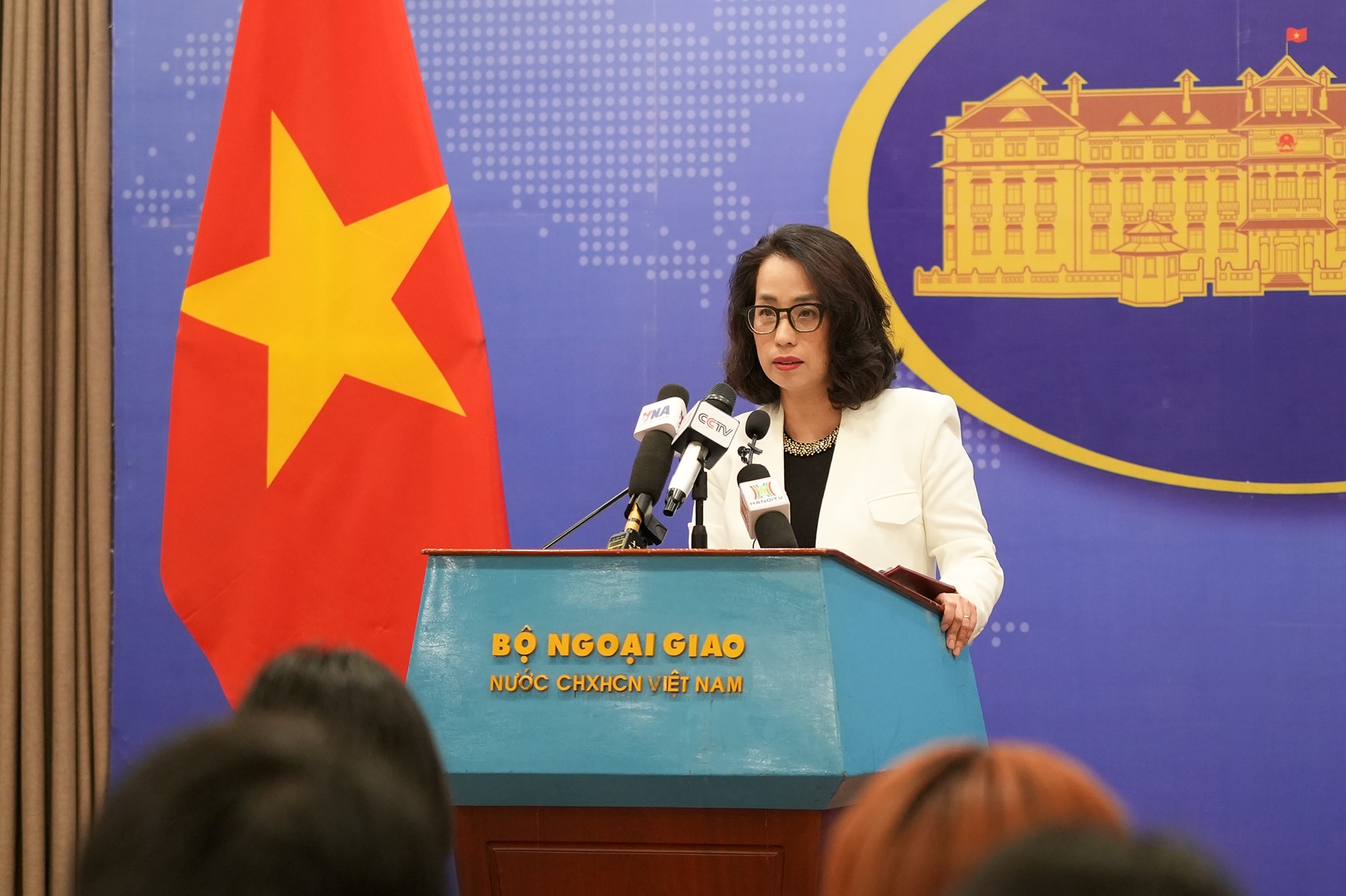 Người phát ngôn Bộ Ngoại giao Phạm Thu Hằng tại họp báo chiều 23-4. Ảnh: Hoàng Linh