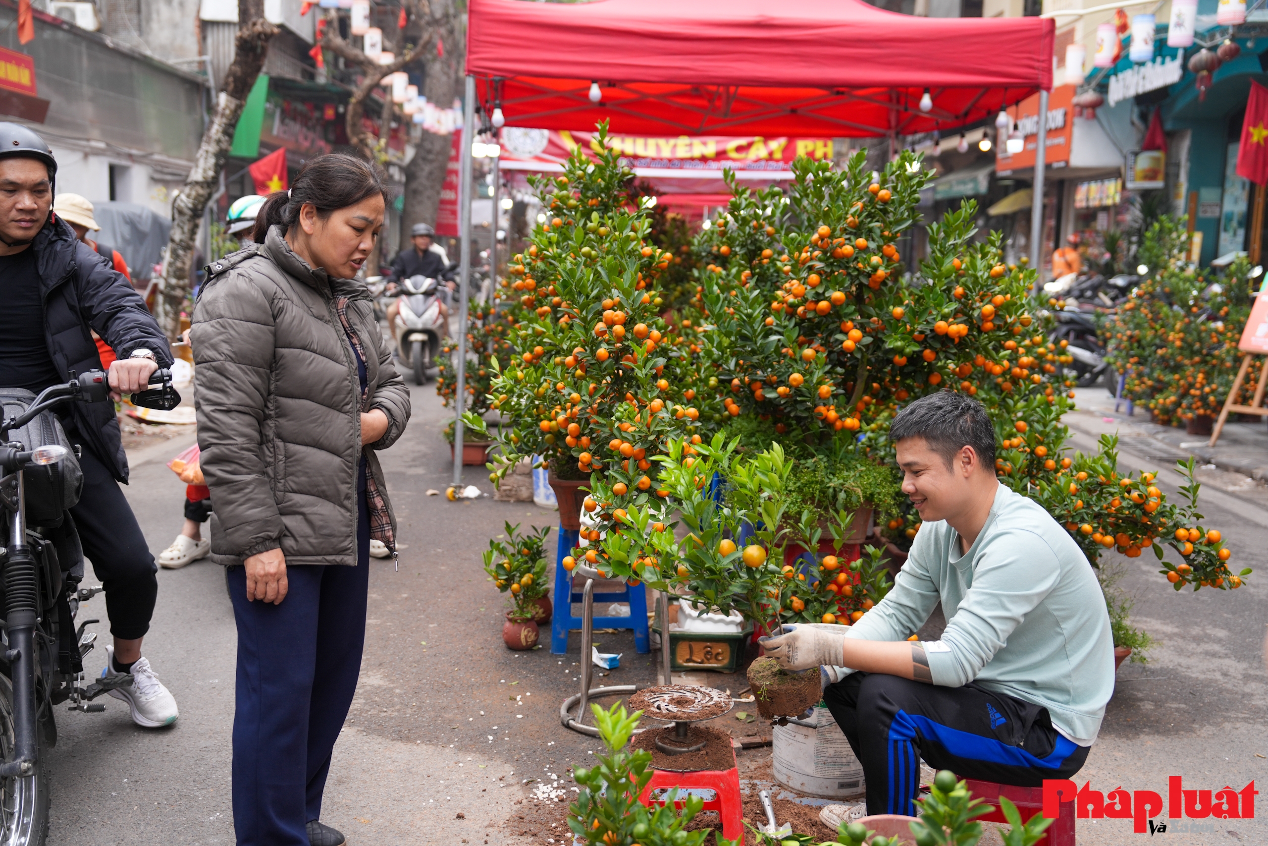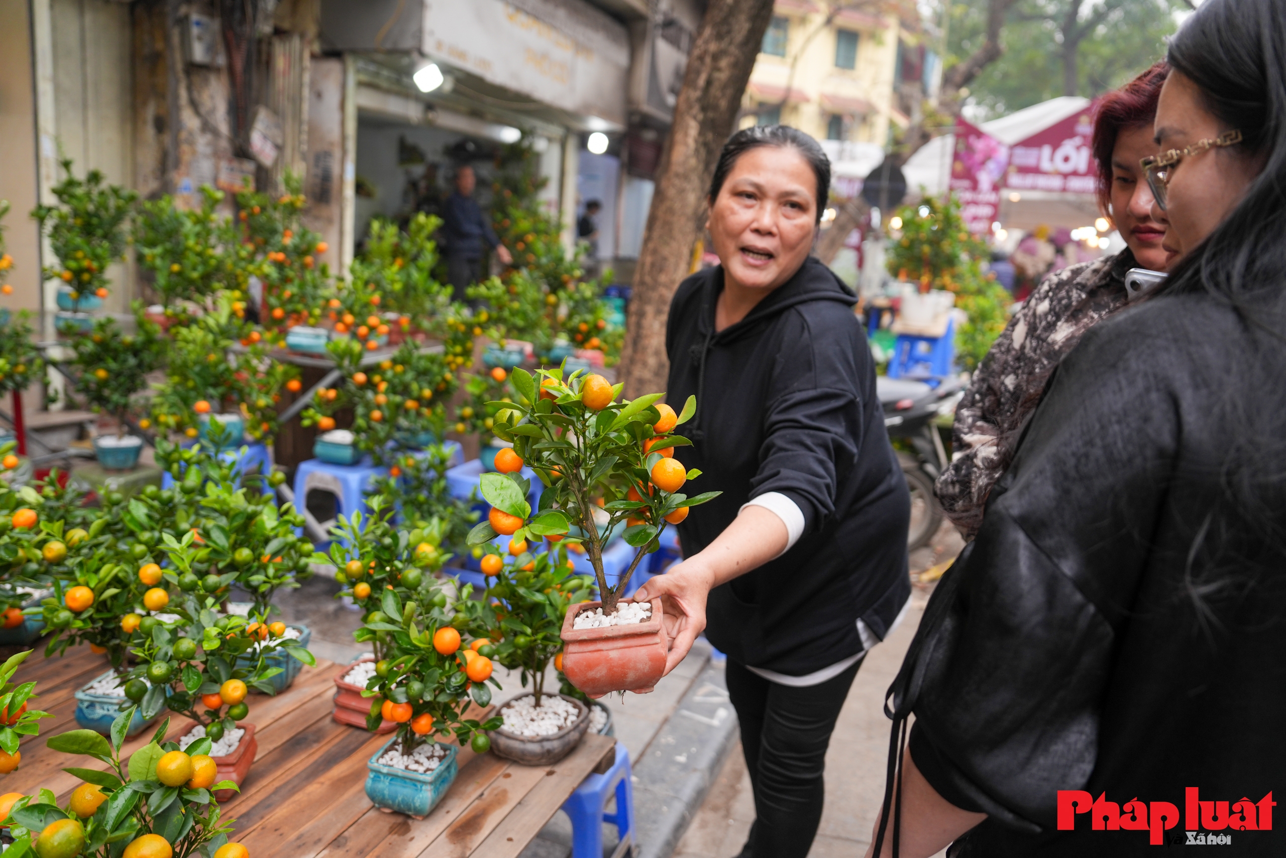 Khu vực bán quất cảnh với nhiều kích cỡ khác nhau, từ quất để bàn đến quất thế lớn, tập trung ở đoạn giáp Hàng Khoai, thuận tiện cho vận chuyển.