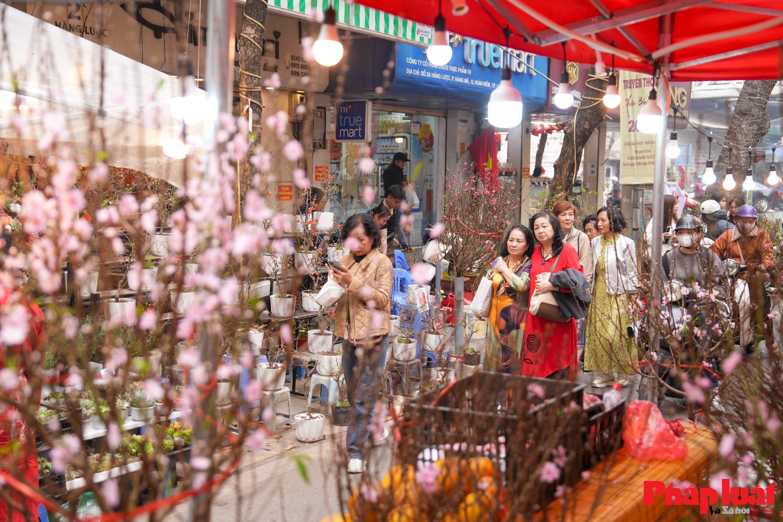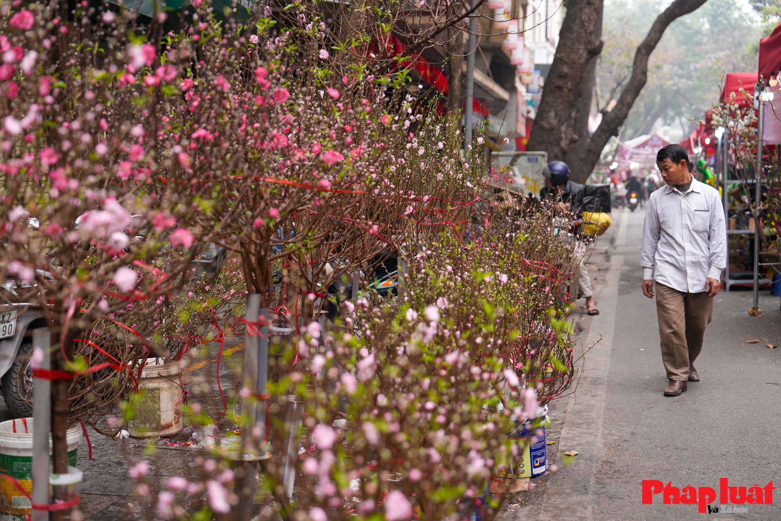 Các gian hàng hoa đào cành và đào thế bày bán dọc phố Hàng Lược, chủ yếu đến từ các vùng trồng đào truyền thống ở Hà Nội và vùng ven, phục vụ nhu cầu chơi đào Tết của người dân nội đô.