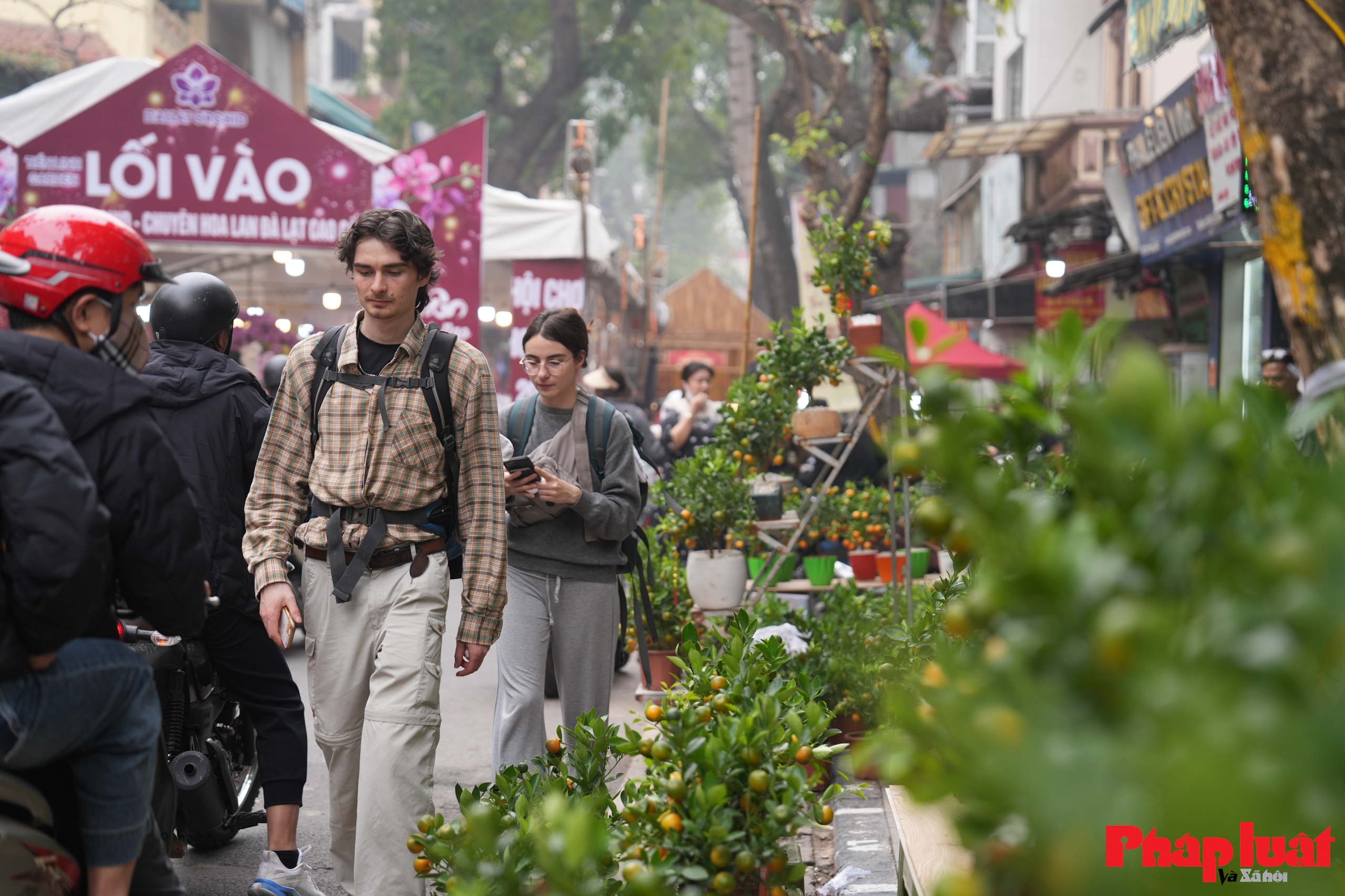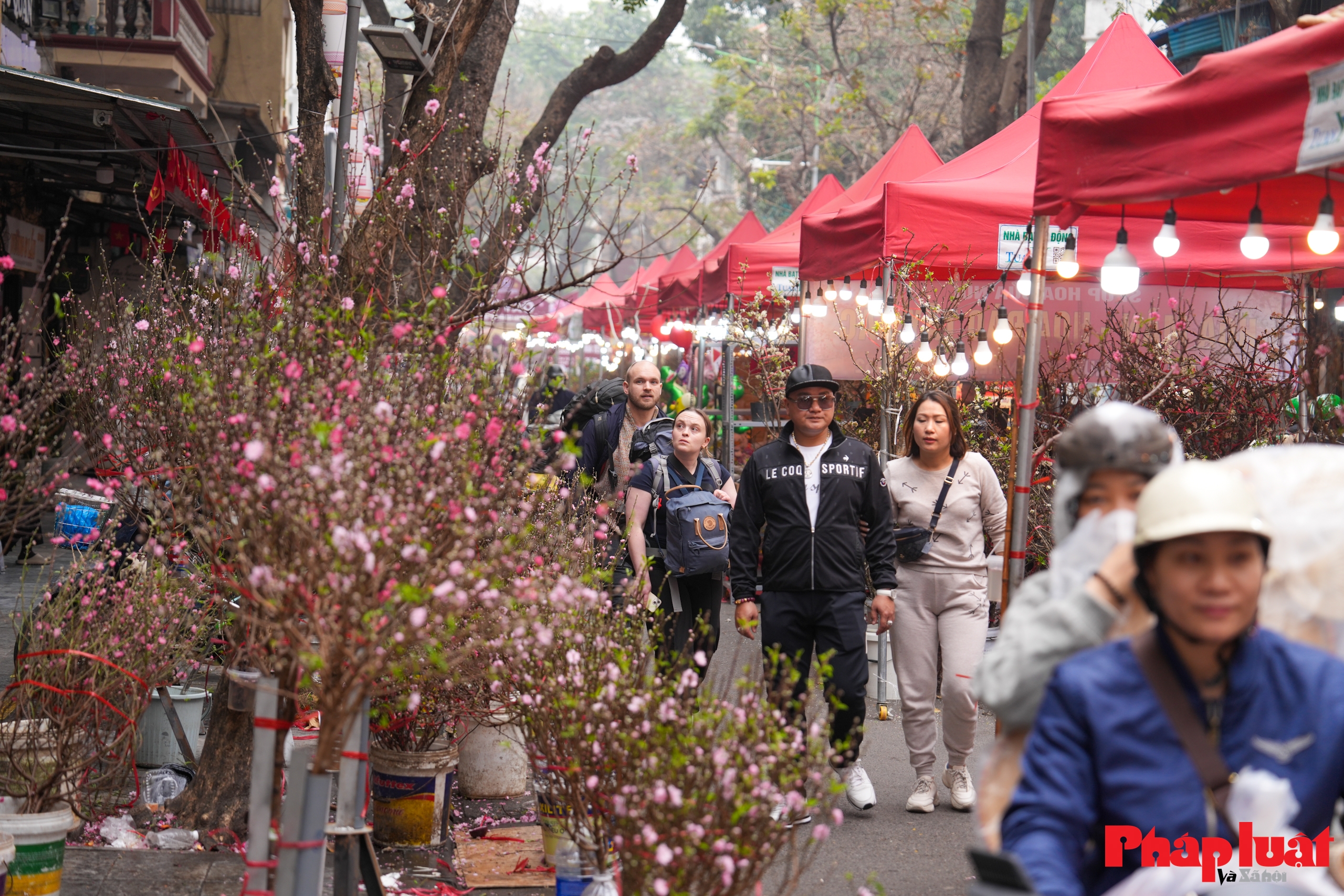 Du khách quốc tế tham quan chợ hoa, tìm hiểu phong tục mua hoa Tết của người Hà Nội thông qua các gian hàng và không gian trưng bày văn hóa.