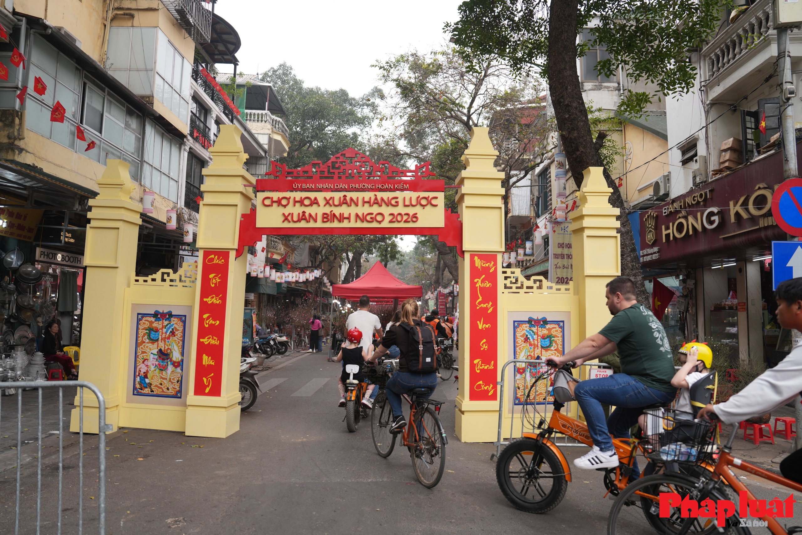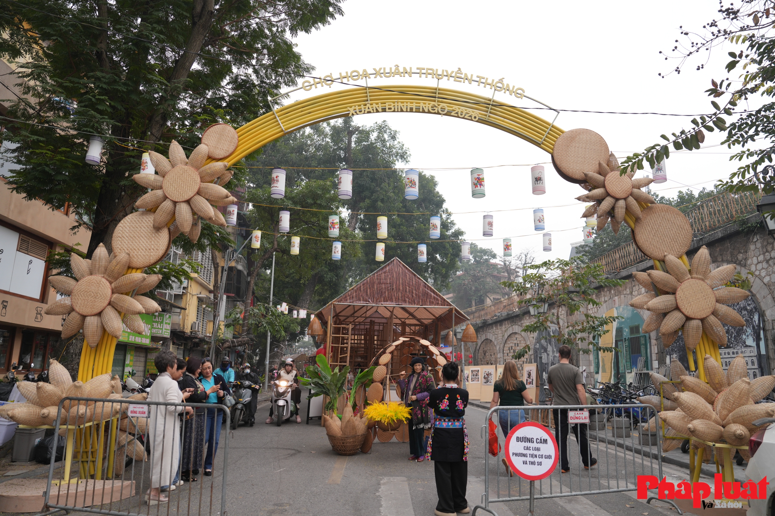 Toàn cảnh phố Hàng Lược trong ngày mở chợ hoa Tết Bính Ngọ 2026, tuyến phố được phân luồng giao thông, ưu tiên không gian cho hoạt động mua bán hoa và tham quan của người dân.