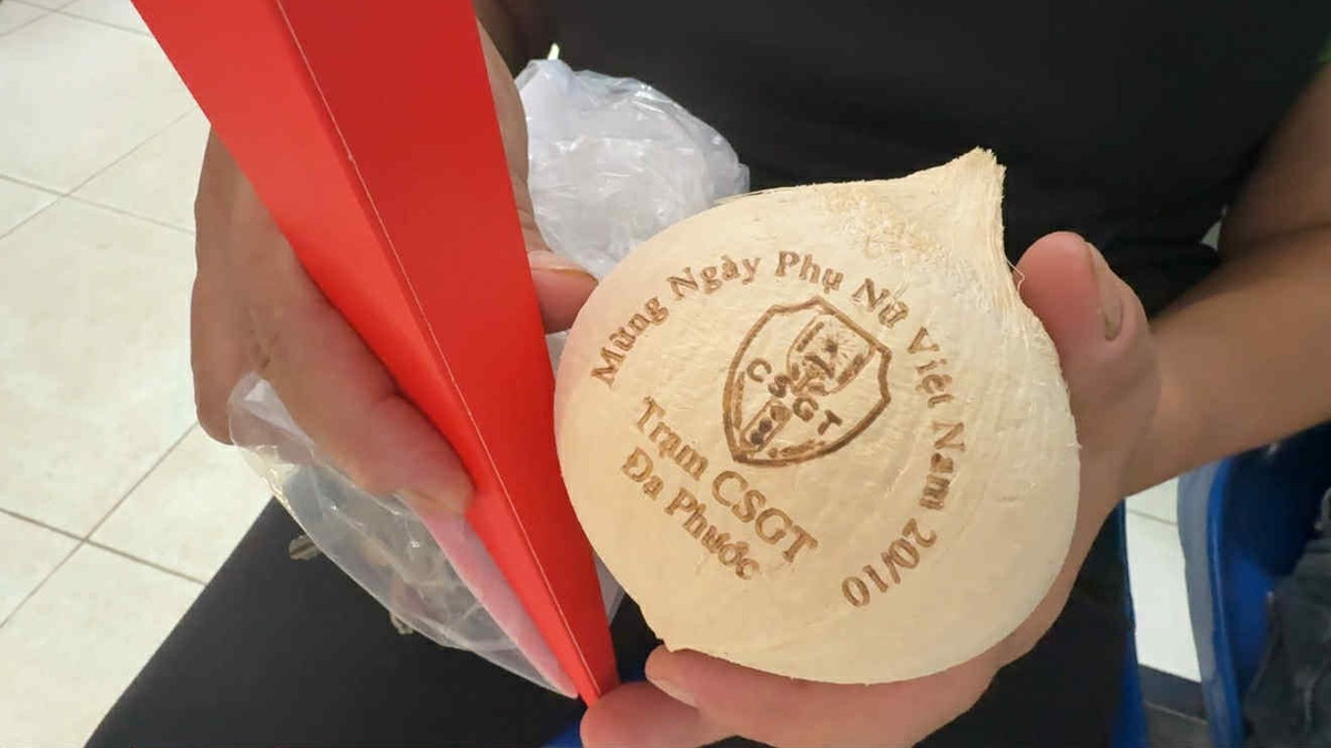 Chị Thái Mỹ Tâm , một người có mặt và nhận quà tặng từ CSGT Đa Phước bày tỏ sự bất ngờ xen lẫn thích thú khi nhận quà tặng là bó hoa cùng quả dừa khắc tỉ mỉ thông tin Trạm CSGT Đa Phước.