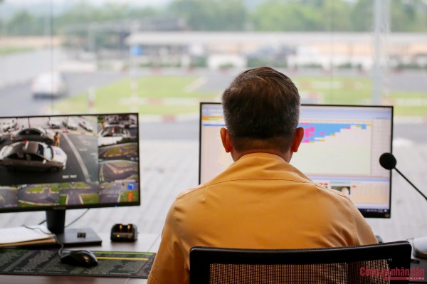 Cán bộ CSGT giám sát hoạt động sát hạch từ Nhà điều hành của trung tâm Hà Thành.