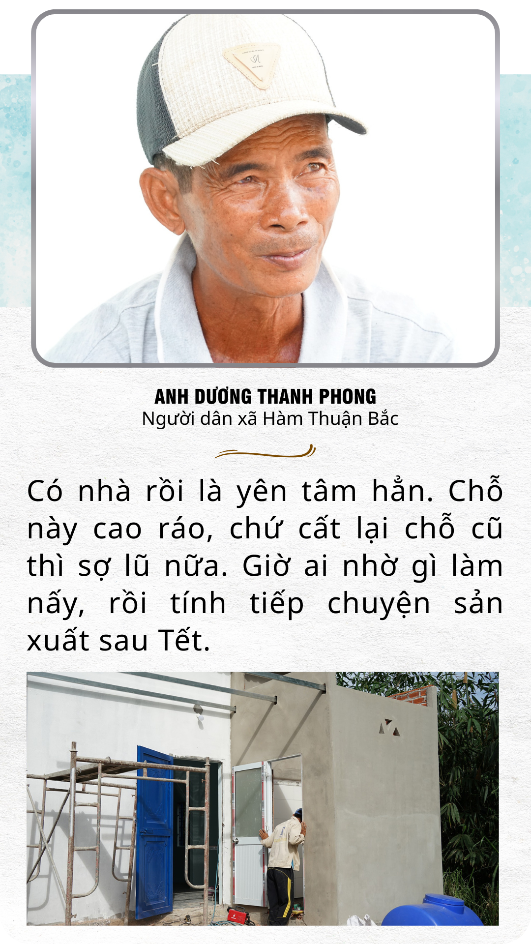 Tuy nhiên, chính trong điều kiện khó khăn ấy, tinh thần trách nhiệm của chính quyền địa phương cùng sự vào cuộc đồng bộ của các lực lượng hỗ trợ đã được thể hiện rõ nét. Xã Hàm Thuận Bắc được hỗ trợ xây dựng 6 căn nhà mới cho các hộ dân bị thiệt hại nặng, trong đó có các hộ ông Nguyễn Thanh Phong, anh Thái Minh Thoại và chị Thái Thụy Thùy Vy (thôn Phú Thái).