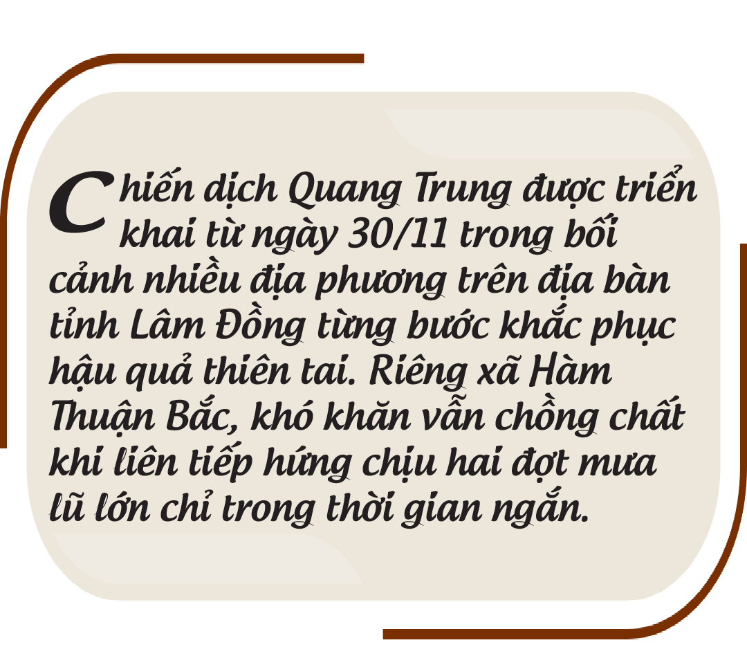 Theo thống kê, hai đợt lũ đã gây thiệt hại cho Hàm Thuận Bắc hơn 50 tỷ đồng; riêng đợt mưa lũ đầu tháng 12/2025 khiến hơn 600 căn nhà bị ngập, 6 căn nhà bị sập hoàn toàn. Đây cũng là địa phương khởi động Chiến dịch Quang Trung muộn hơn so với nhiều nơi khác trong tỉnh.