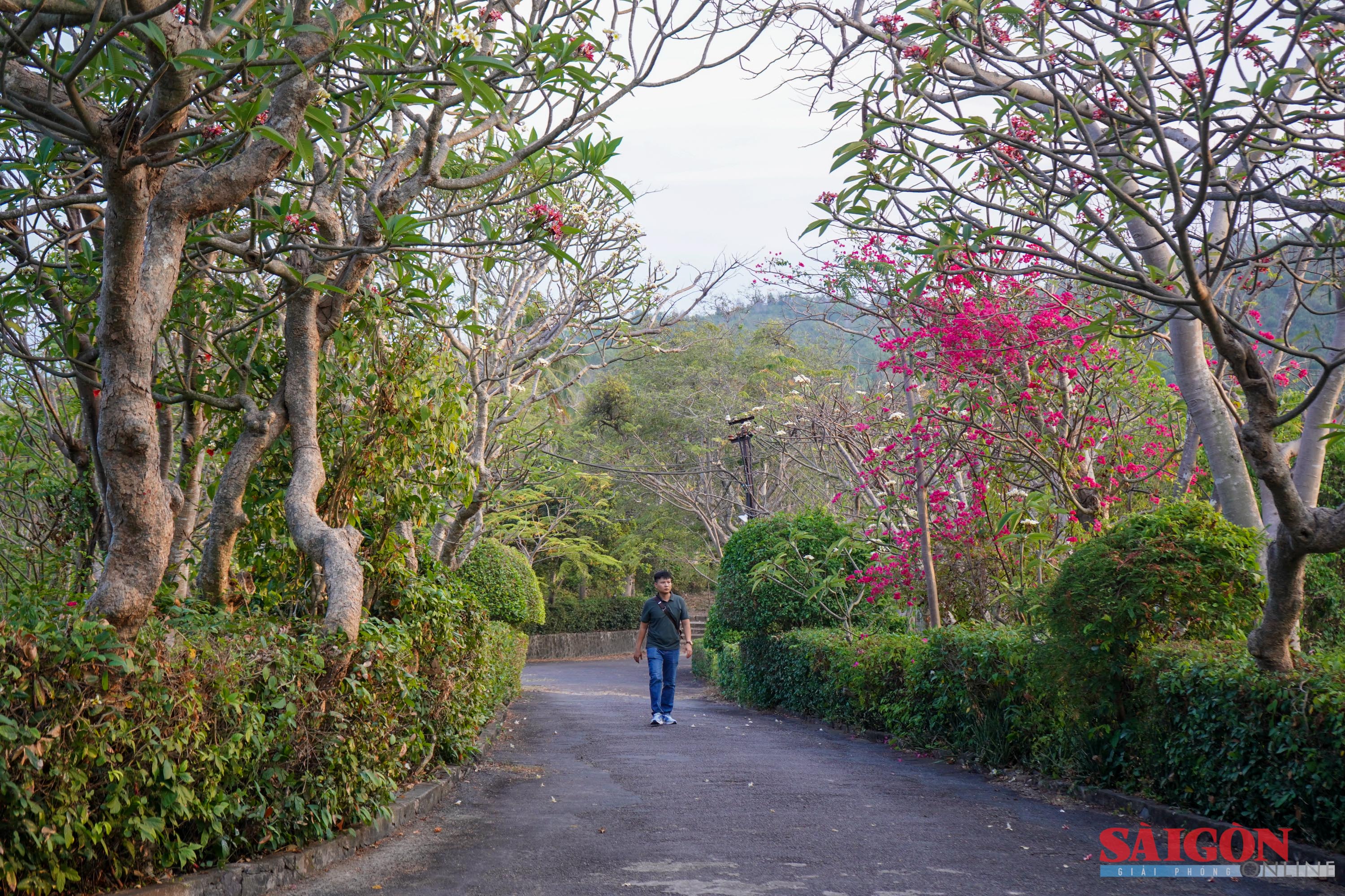 Đường dẫn lên di tích lầu Bảo Đại hai bên nhiều cây xanh, tạo cảnh quan rực rỡ