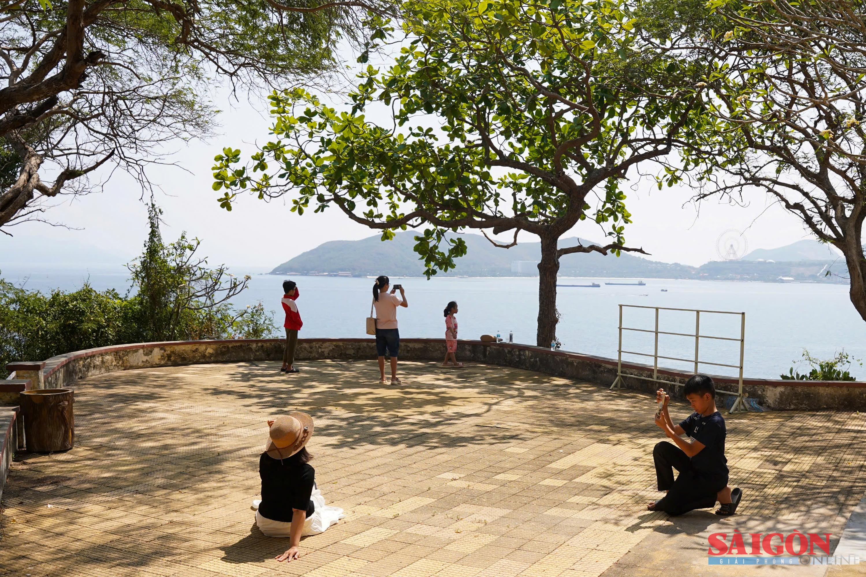 Du khách chụp ảnh tại sân trước tòa Nghinh Phong, mặt đối diện đảo Hòn Tre