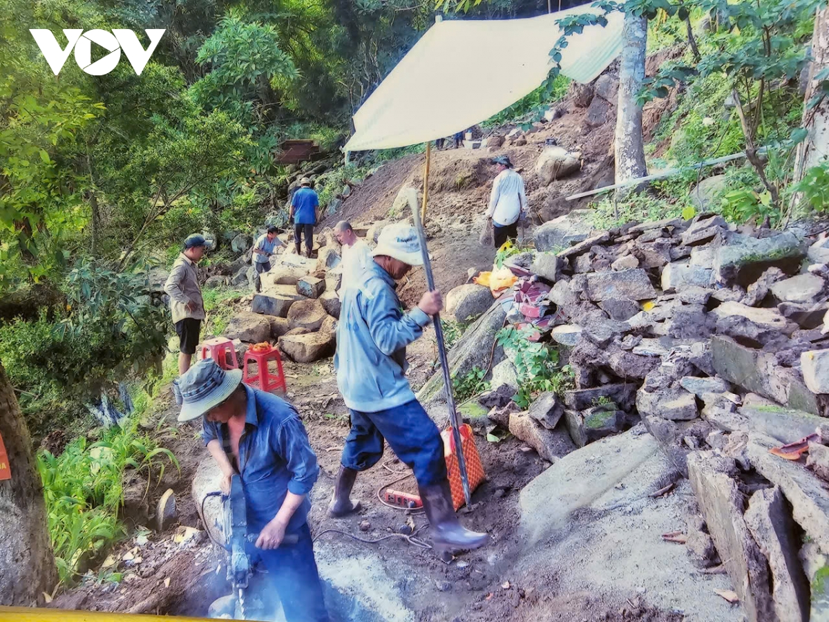 Hình ảnh 1 số công nhân cùng ông Thích Quảng Đạo đang dùng máy móc khoan phá đá tại rừng phòng hộ di tích Quốc gia núi Chứa Chan năm 2018 ( Ảnh: Người dân cung cấp)