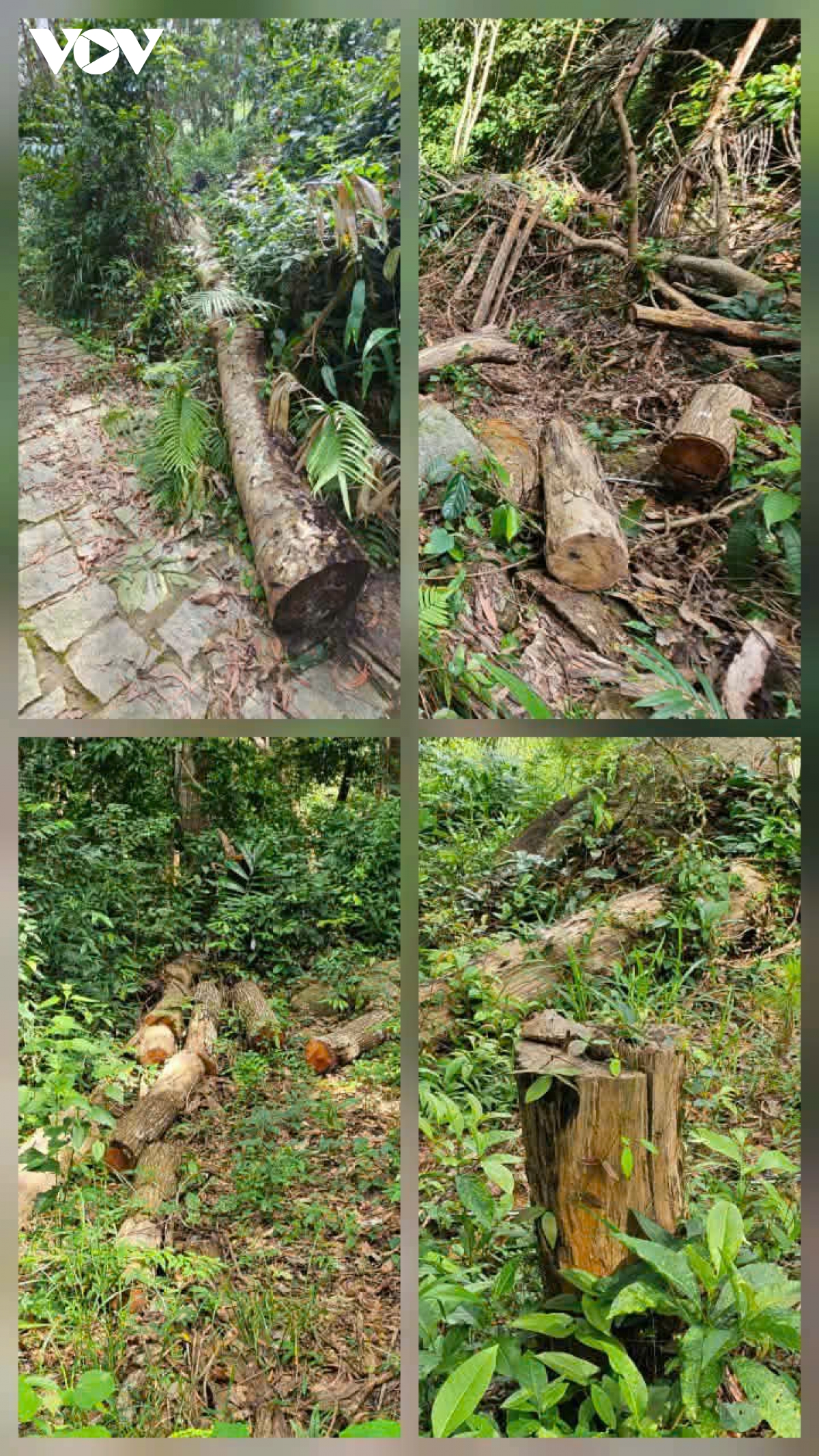 Dấu tích nhiều thân cây bị chặt phá vứt ngổn ngang cạnh lối đi xây dựng bằng đá được phá dỡ trái phép tại núi Chứa Chan