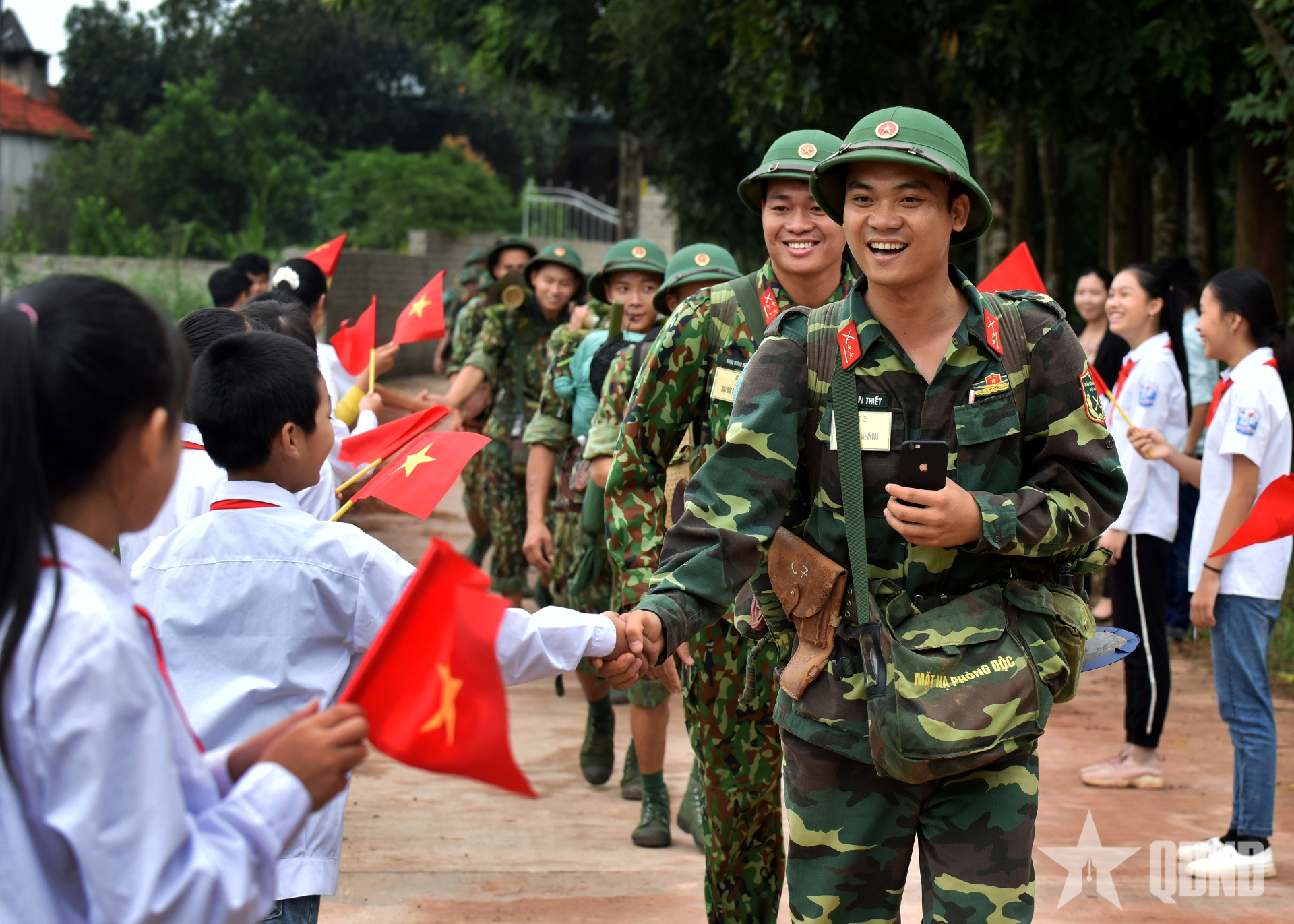 Các cháu thiếu nhi vẫy chào cán bộ, chiến sĩ Sư đoàn 3 (Quân khu 1) trên đường hành quân diễn tập.