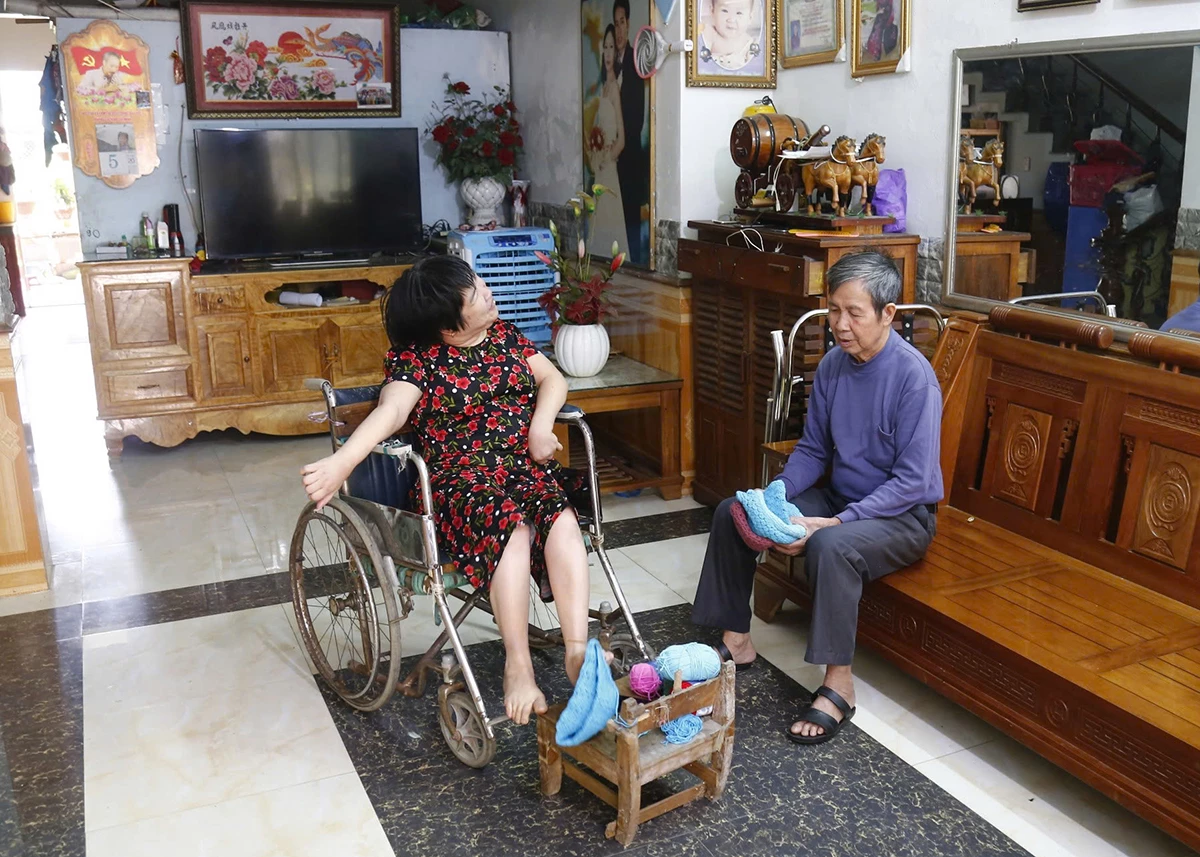 Dù bị khuyết tật tay không cử động được nhưng chị Hoàng Lan Hương, phường Minh Xuân hằng năm vẫn đan mũ len tặng học sinh vùng cao.